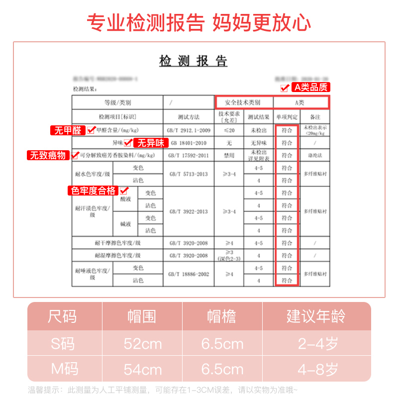 54CM recommended 4-8 years of age (adjustable cap circumference) 52CM recommended 2-4 years old (adjustable cap circumference)