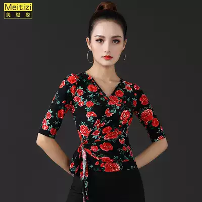 Latin dance practice clothes women's new mid-sleeve social dance V-neck modern top adult national standard dance clothes printing