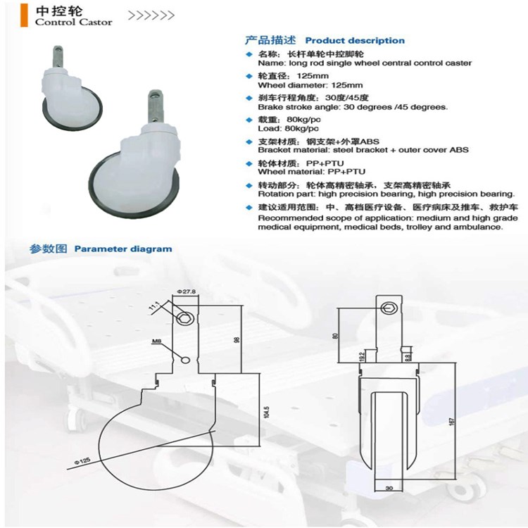 Medical emergency care automatic operation operation nursing bed trolley universal mute second gear central control casters 5 inch