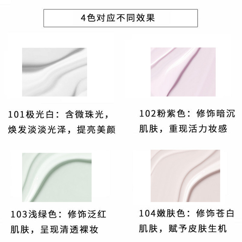#101极光白(micropearly)#102粉紫色 suitable for yellowskin color#103浅绿色 suitable for pan-red complexion#104嫩肤色 suitable for pale complexion two please shoot below