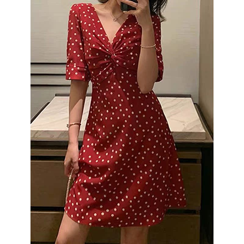 Sandro Svpr red dress women 2021 summer new French waist thin temperament V-neck skirt