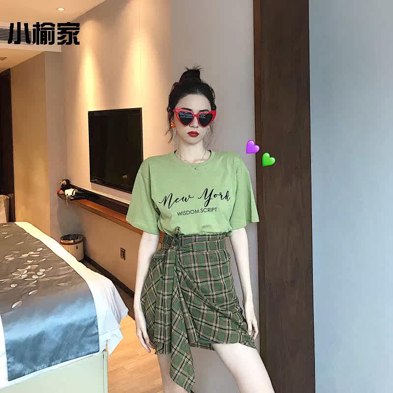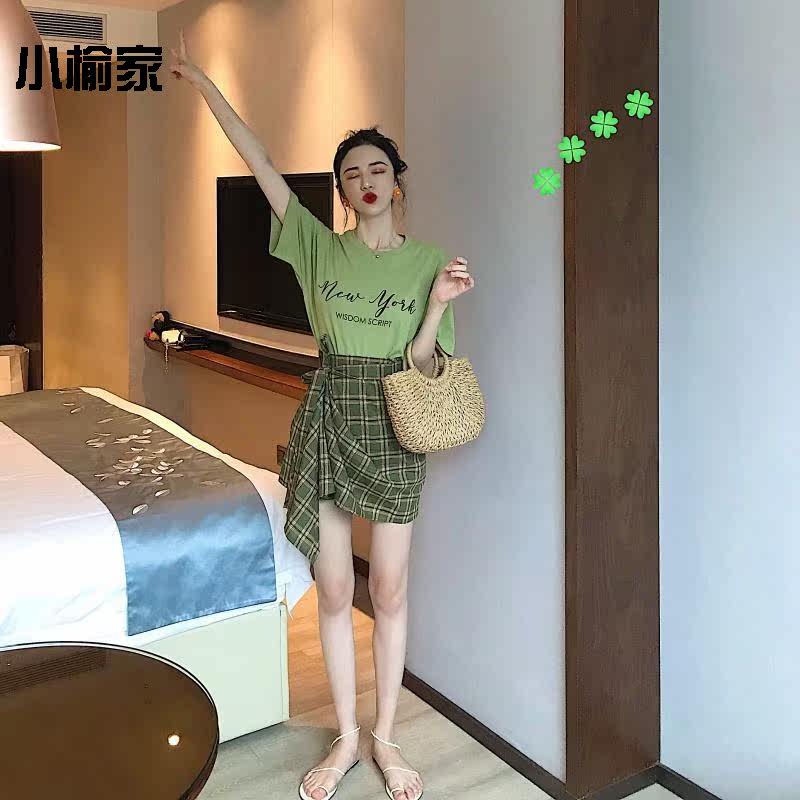 Two sets of French small crowdage slideshow loose short sleeve T-shirt plaid half body skirt suit women in summer very fairy