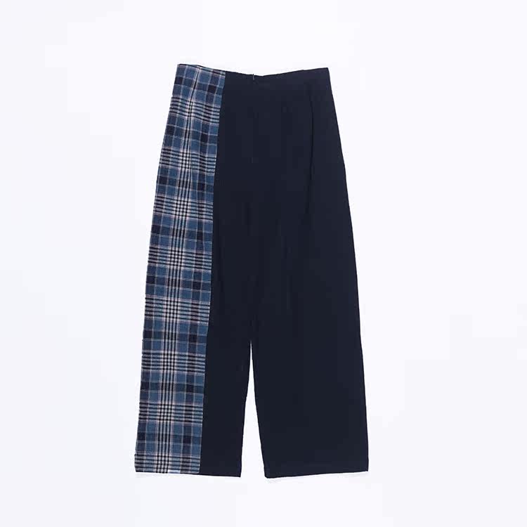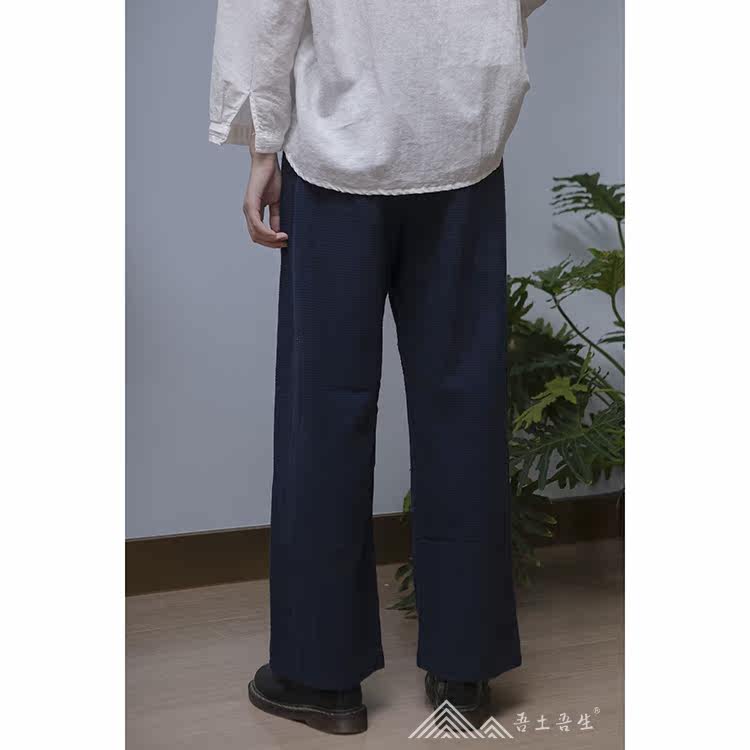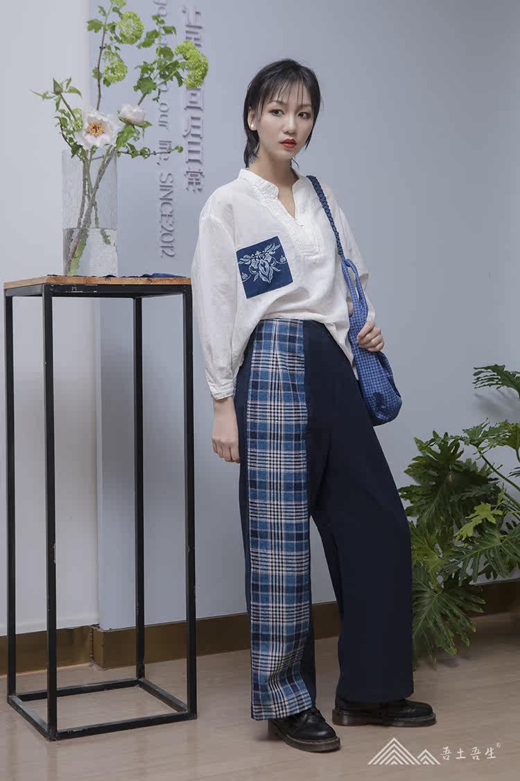 My native force Zhou Chun's new blue indigo weave handmade lattice earth cloth splicing straight cylinder pure cotton female long pants