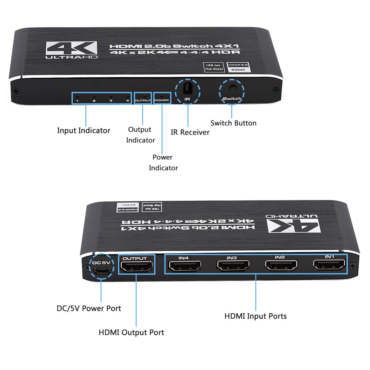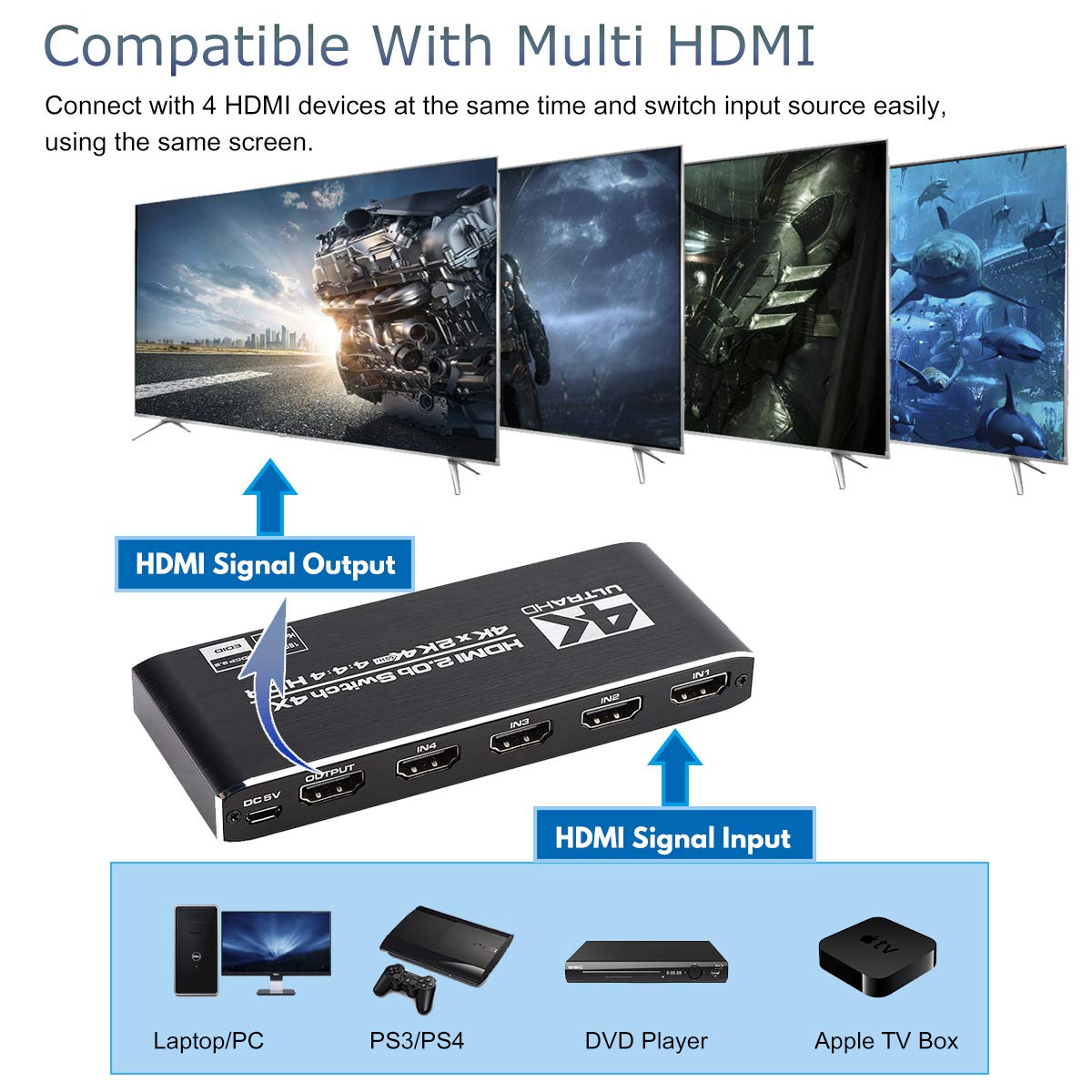 hdmi2 0 switcher 4 in 1 out 4K60hz HD video 4 in 1 out 4k HDR10 Dolby Atmos