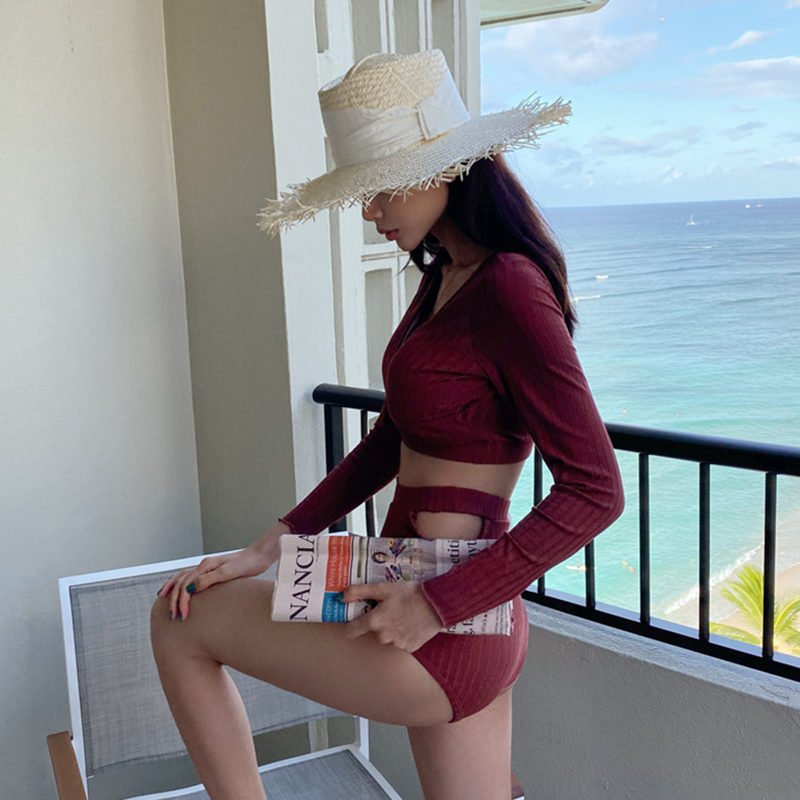 New red long sleeve sunscreen Surfing wetsuit Sexy dew Slim Conservative High Waist Veil Two-piece Swimsuit