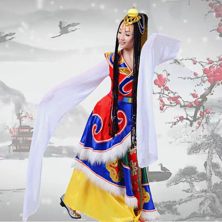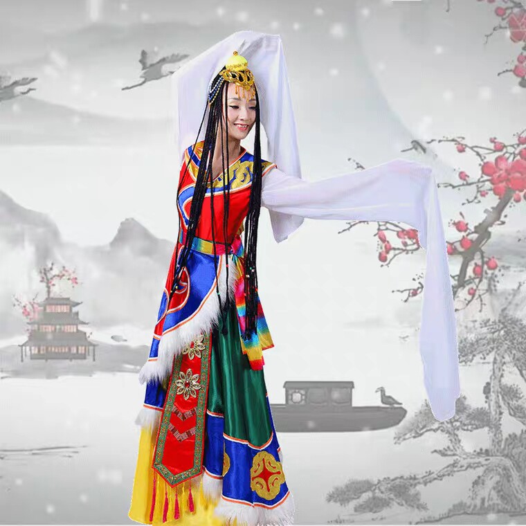 The new Tibetan dance performance costume women's water sleeve Tibetan robe long skirt Mongolian performance Tibetan ethnic minority dance costume