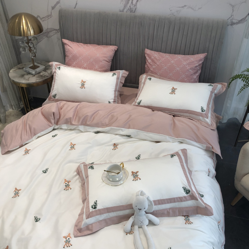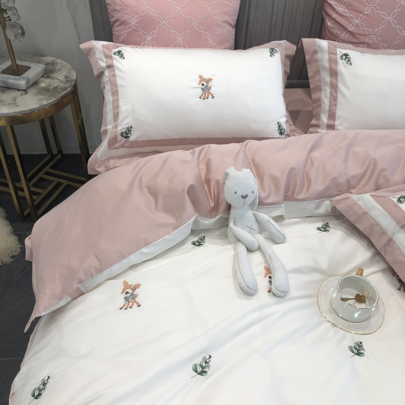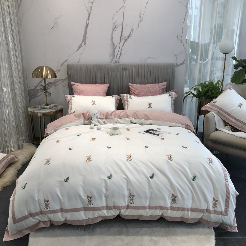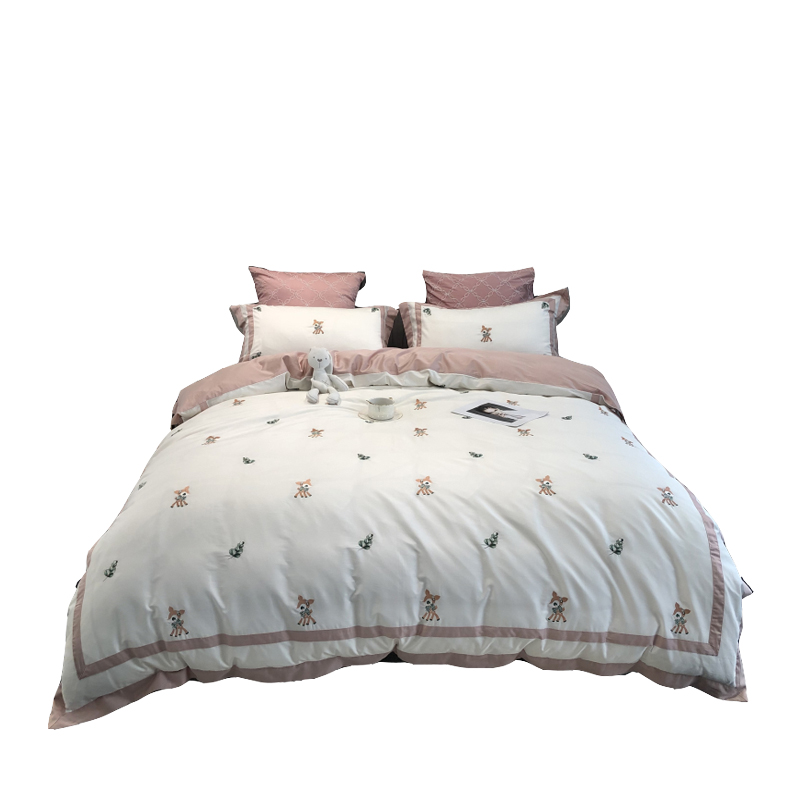 Cartoon cute 60 long suede cotton full cotton four pieces Embroidery Little Deer Pure Cotton Collared AB Face Bedding bedding-Taobao