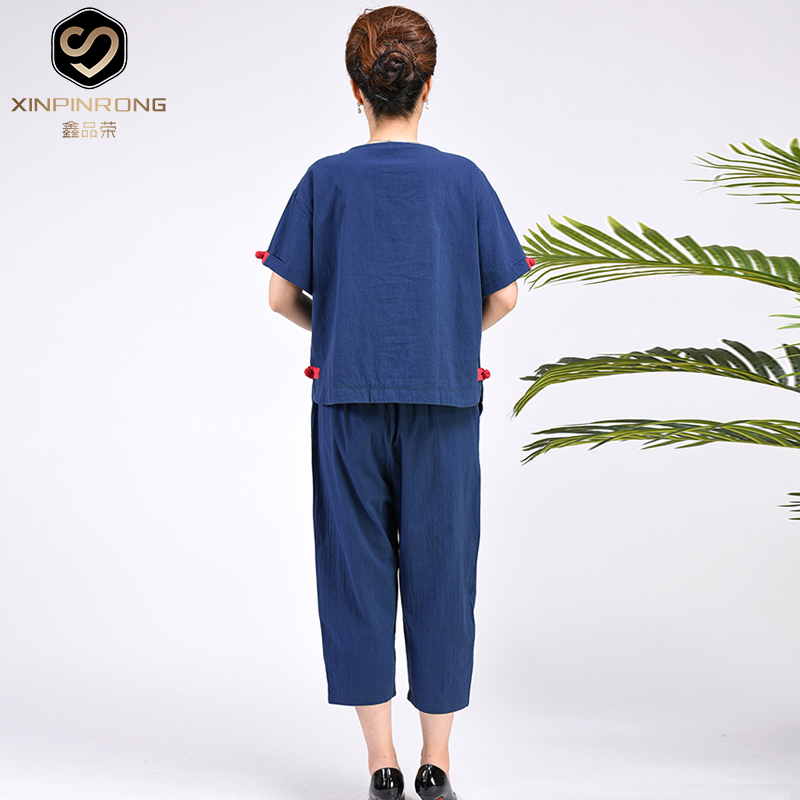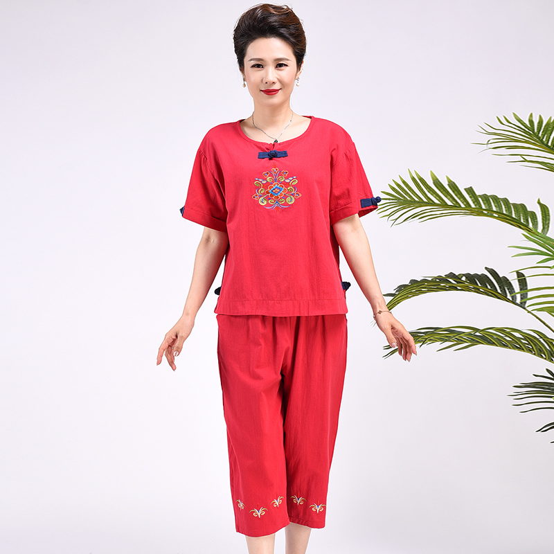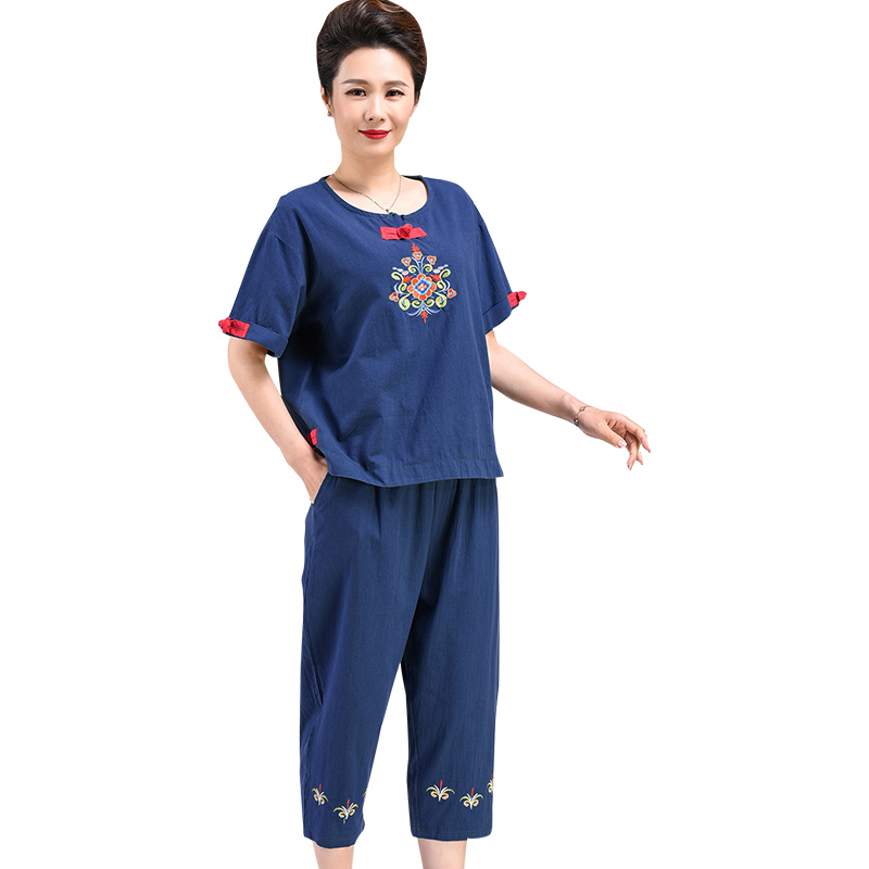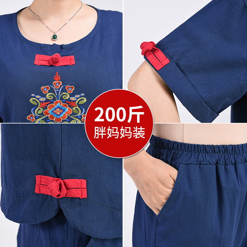 Middle-aged and elderly women's clothing plus fattening codes loot two-piece suit 200 catty Mama dress ethnic wind embroidered T-shirt