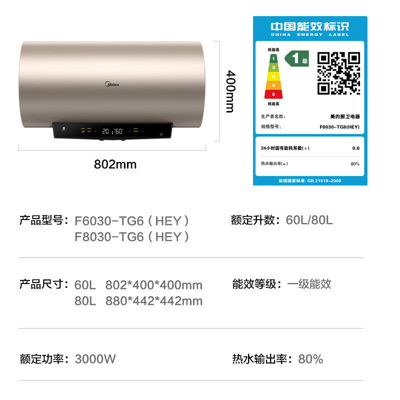 Midea 60-litre electric water heater frequency conversion rapid heat intelligent sterilization water storage type electricity saving household 80L dressing room TG6