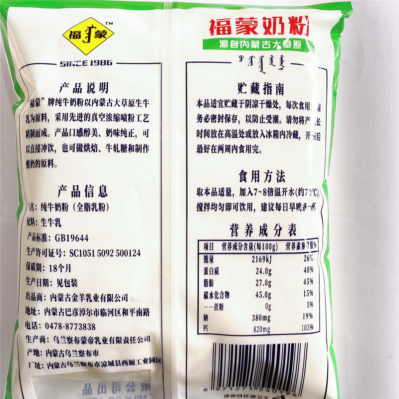 Fumong Pure Milk Powder 320g Inner Mongolia Whole Milk Powder packed breakfast for adult children milk powder