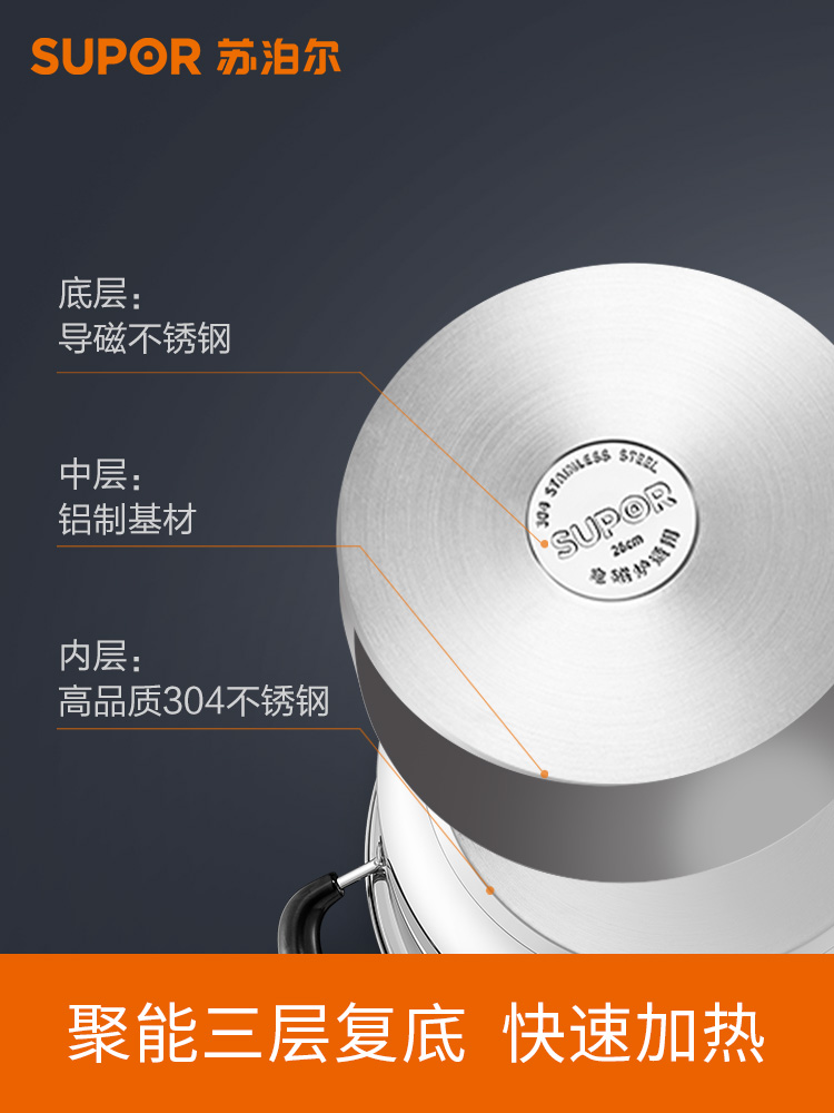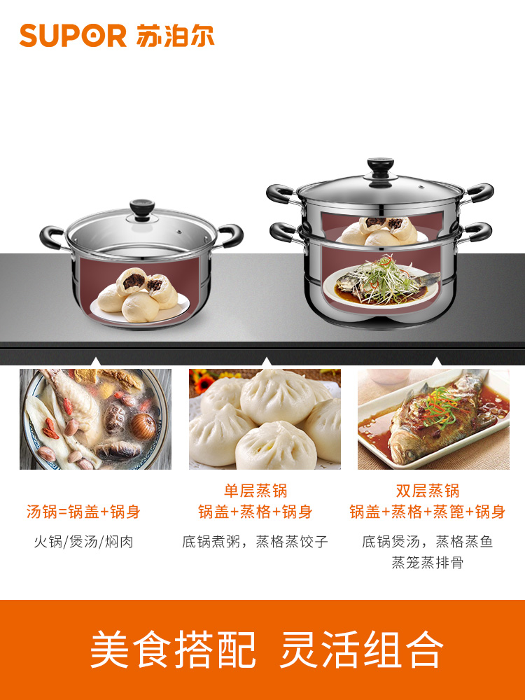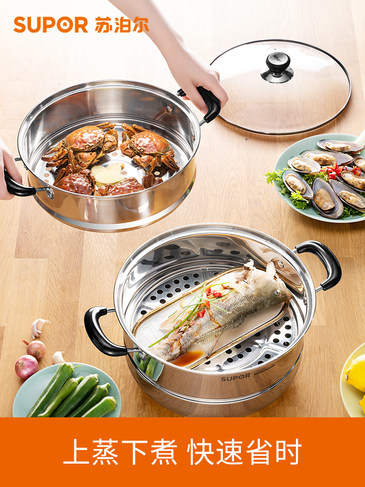 Supor steamer household thickened 304 stainless double layer 2 everyone uses steamer induction cooker gas stove universal 26cm