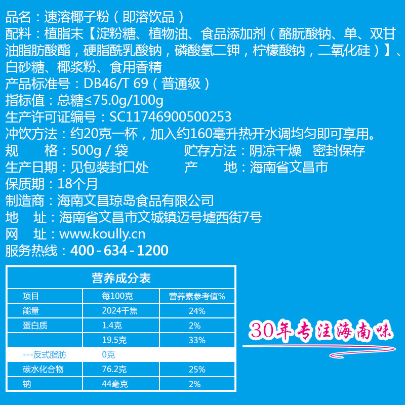 koully Hainan specialty instant coconut powder 500g instant coconut milk coconut milk powder breakfast baked pastry coconut powder