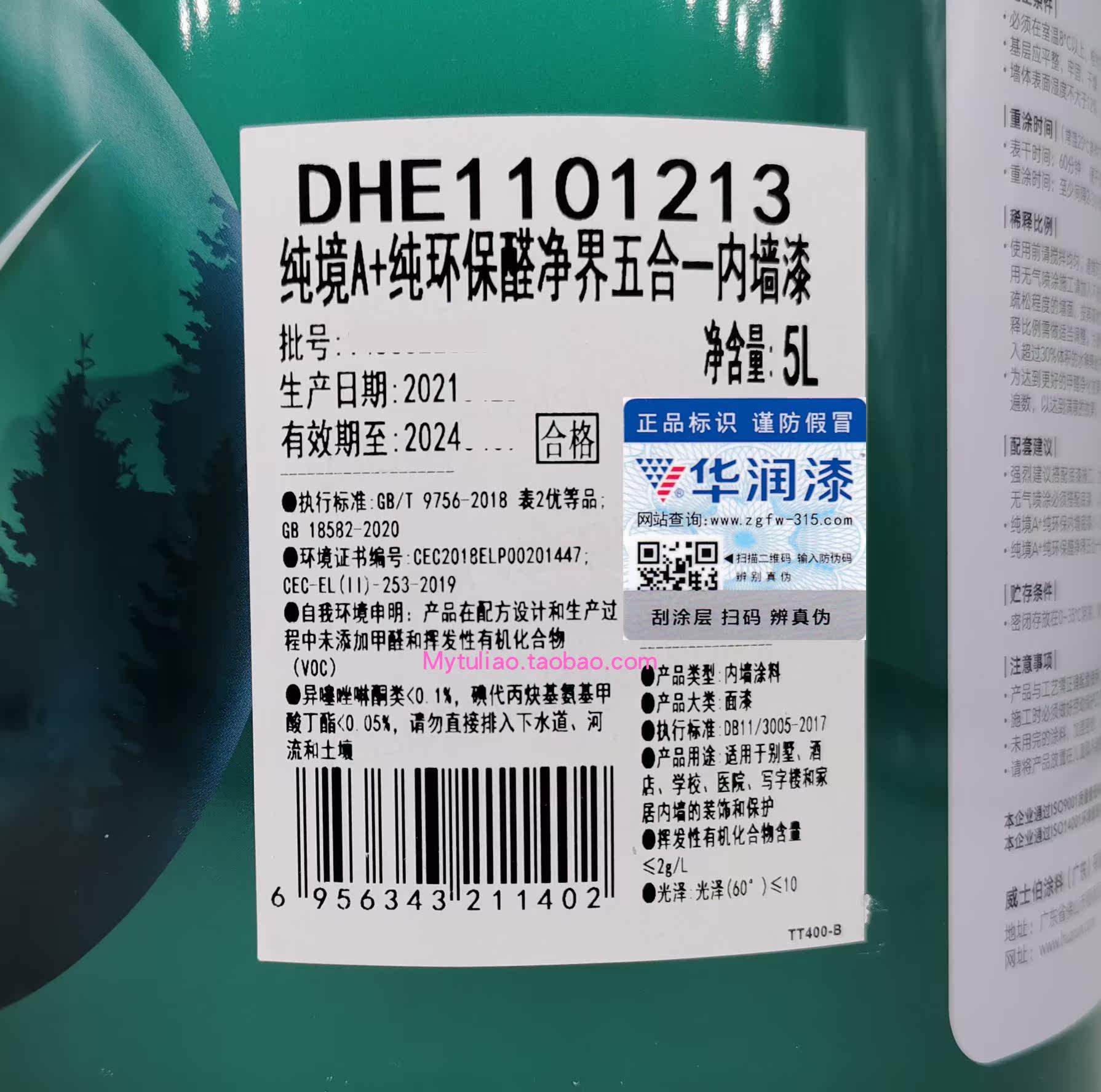 China Resources Lacquer Pure Environment A Pure Environmental Protection Aldehydes Net Five All-in-one Interior Wall Lacquer DHE1101213-5L Water-based Paint