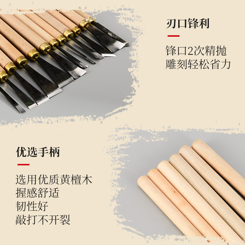 Wooden carving tool Dongyang hand carpentry knife flat triangular slant knife combination set 12 pieces of carving knife