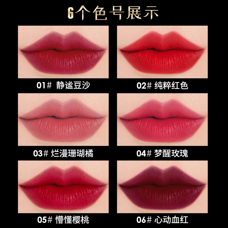 01#Quiet Bean Paste 02#Pure Red 03#Brilliant Coral Orange 04#Dream Awakening Rose 05#Unconscious Cherry 06# Heart Blood Red