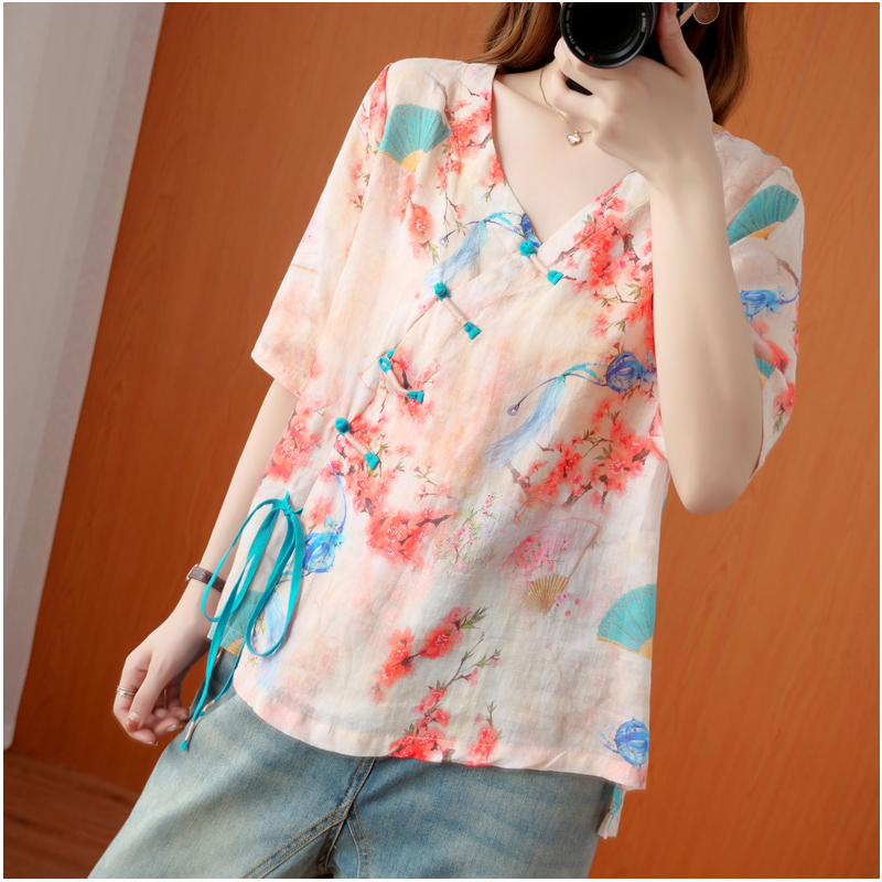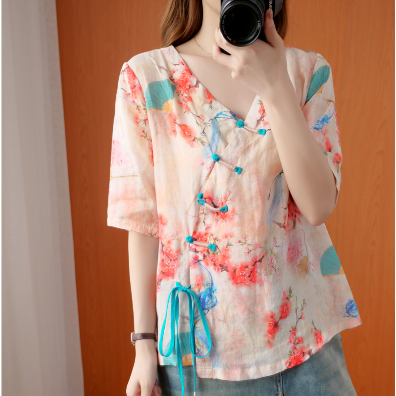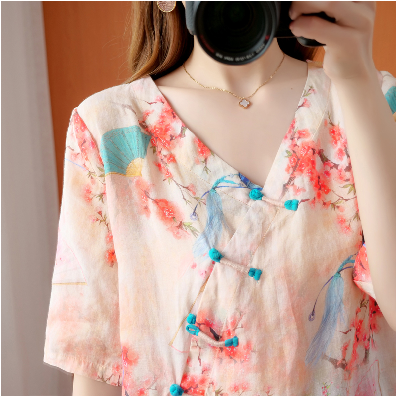 Cotton and Hemp Chinese style retro oblique placket shirt women's large size printing thin section literary and artistic plate buckle V-neck lace-up linen top summer