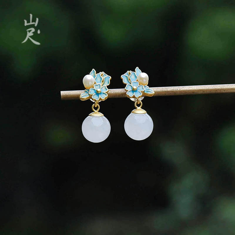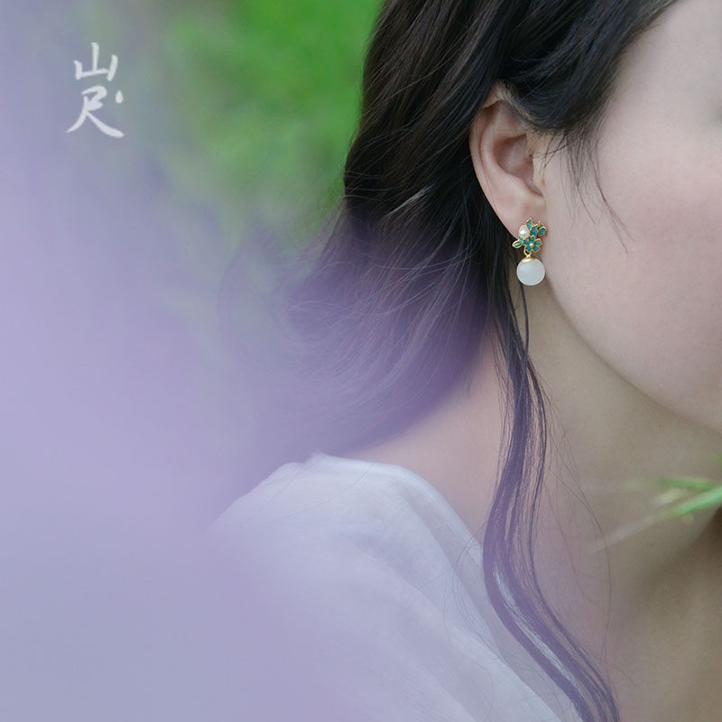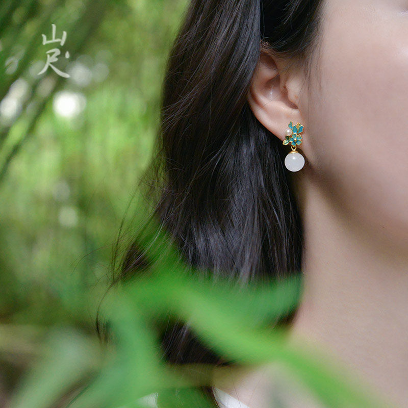 Mountain ruler) Jing Wei Natural and Tian jade pendant 925 pure silver plated 18k gold pearl ear nail female national wind ear decoration original