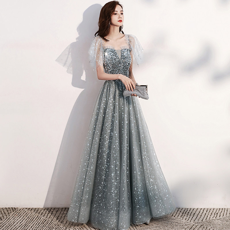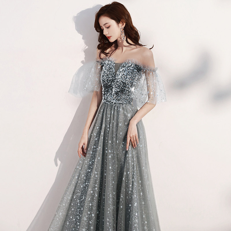 Small evening dress female 2022 new banquet temperament one word shoulder high-end celebrity host light luxury niche high-end sense