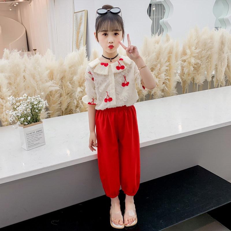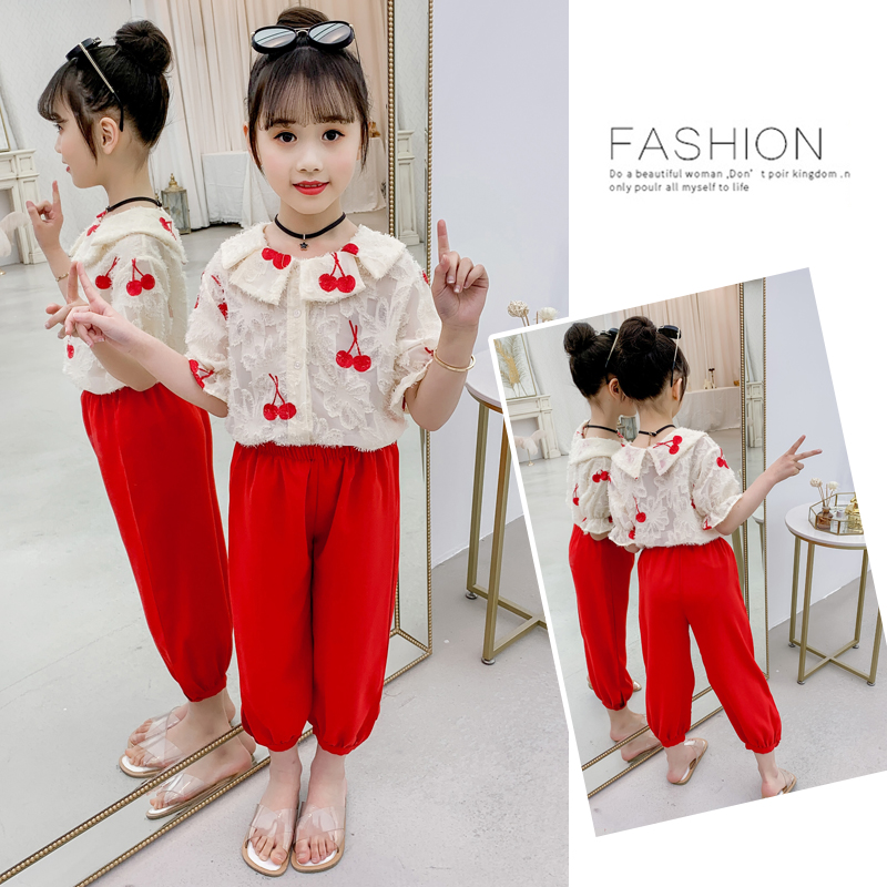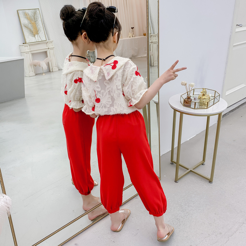 Girl Foreign Pie Suit Nets Red Summer Dress 2022 New Korean Version Children Trendy Short Sleeve Fashion Mosquito Pants Two Sets
