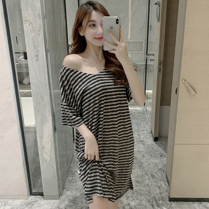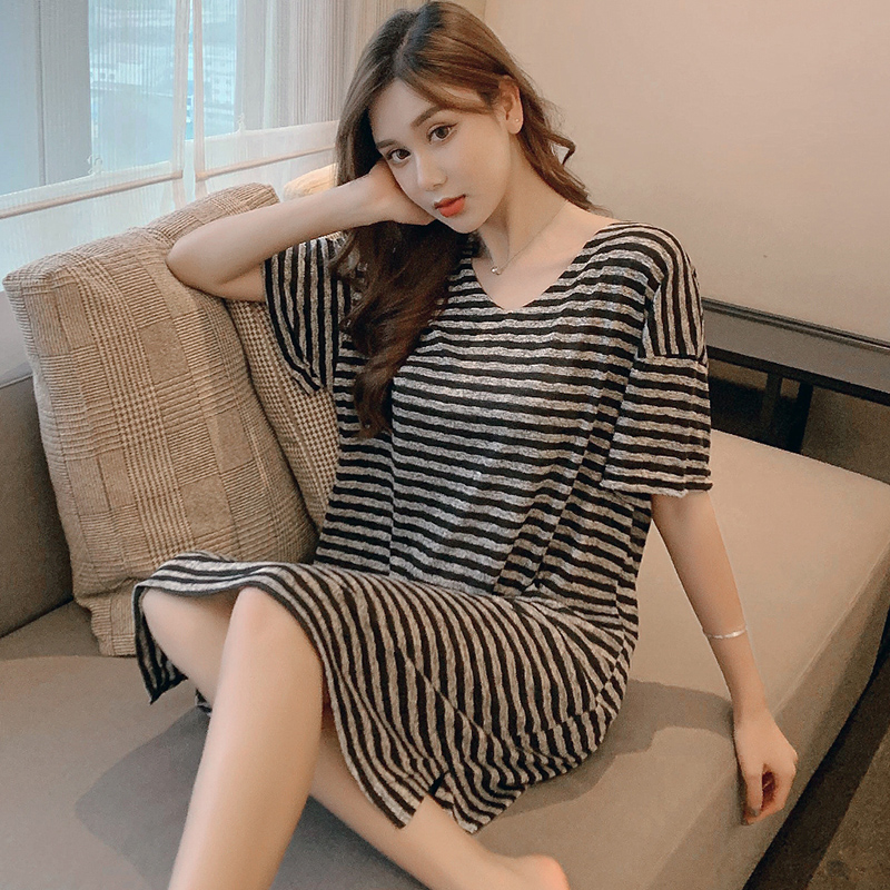 Sleepwear Sleeping Dress Woman Summer Cute Sexy Striped Modale Short Sleeve Net Red Burst private room Spring and Autumn Day Home