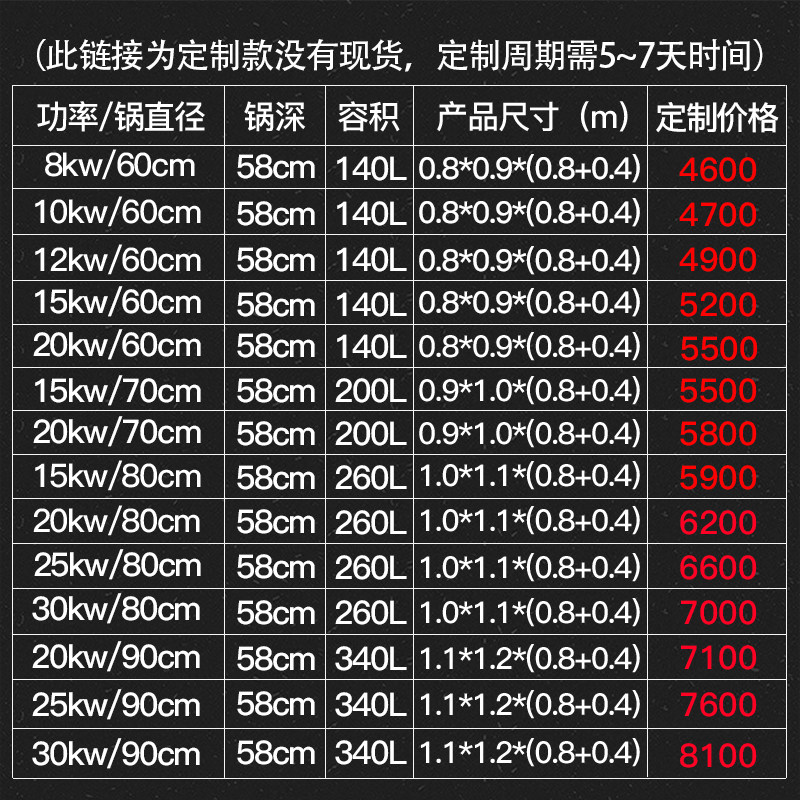 60CM Integrated soup stove (140L) 70CM integrated soup stove (200L) 80CM integrated soup stove (260L) 90CM integrated soup stove (340L)