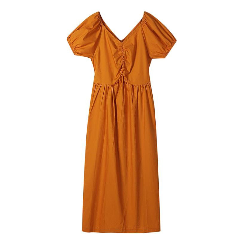 Berry likes you and likes big Pang custom summer French long dress solid color bubble sleeve V-neck Peach dress for women