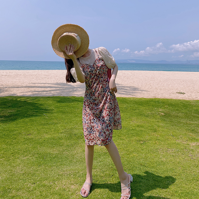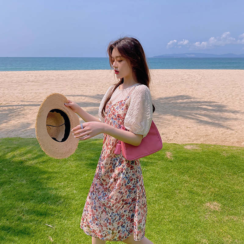 French floral chiffon dress summer 2021 new fake two pieces of first love small floral skirt female summer little man