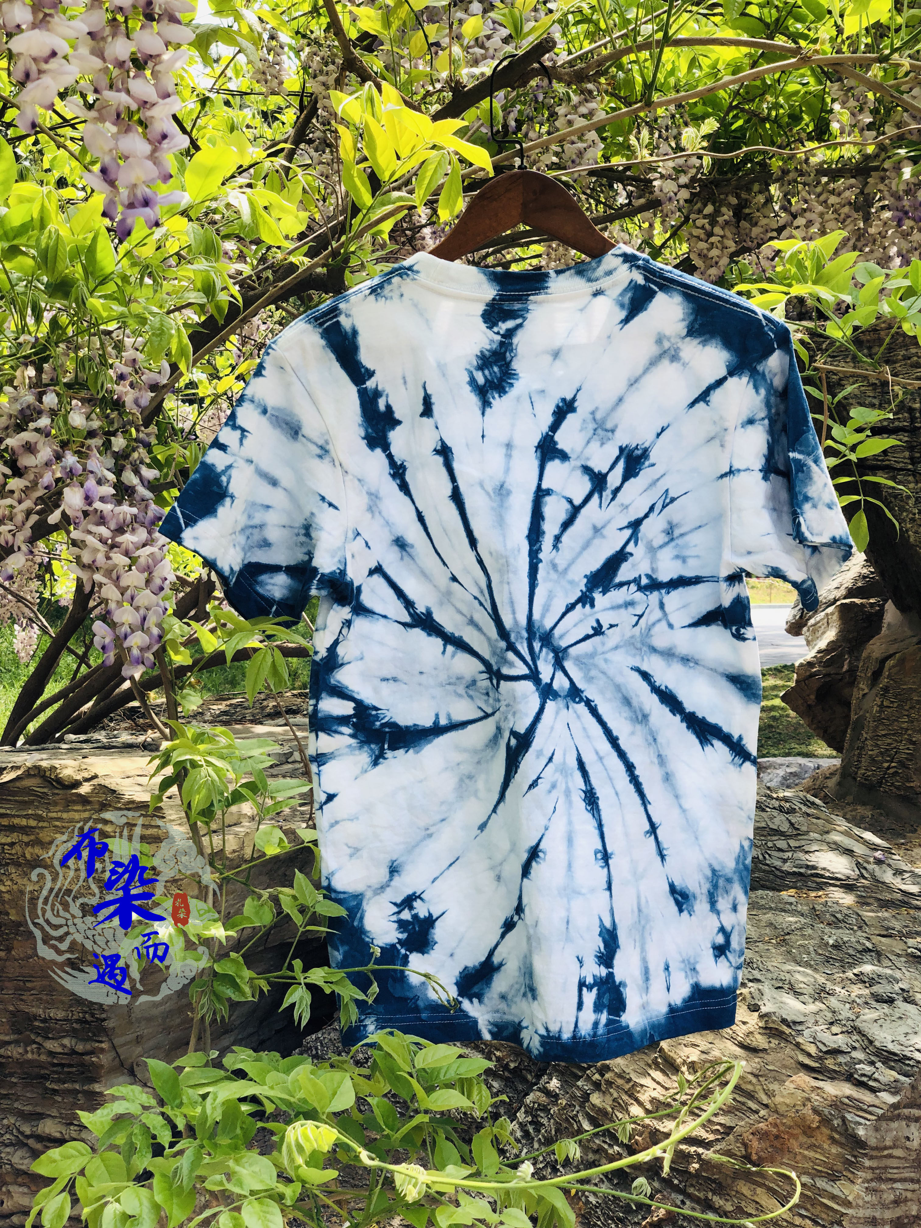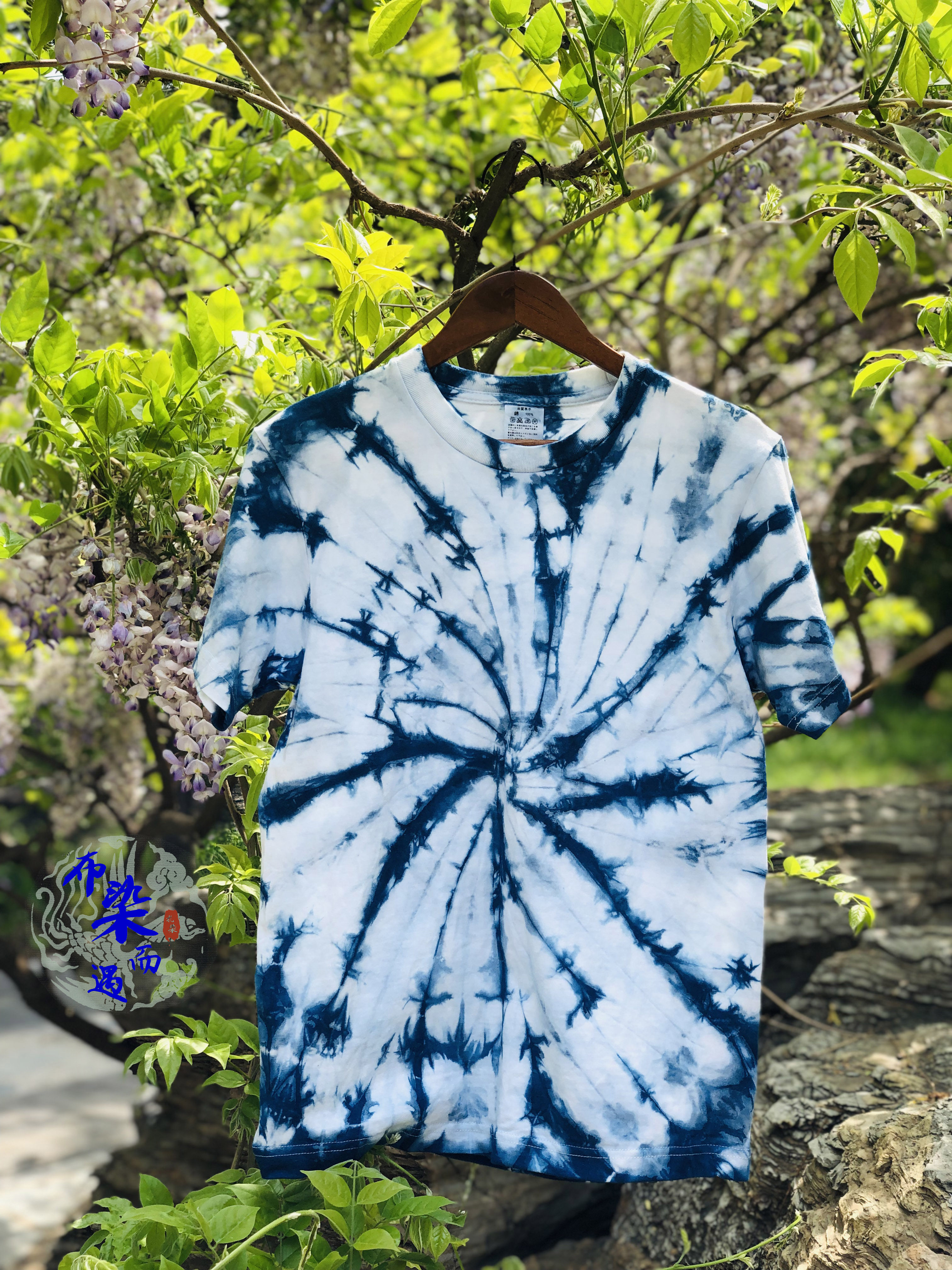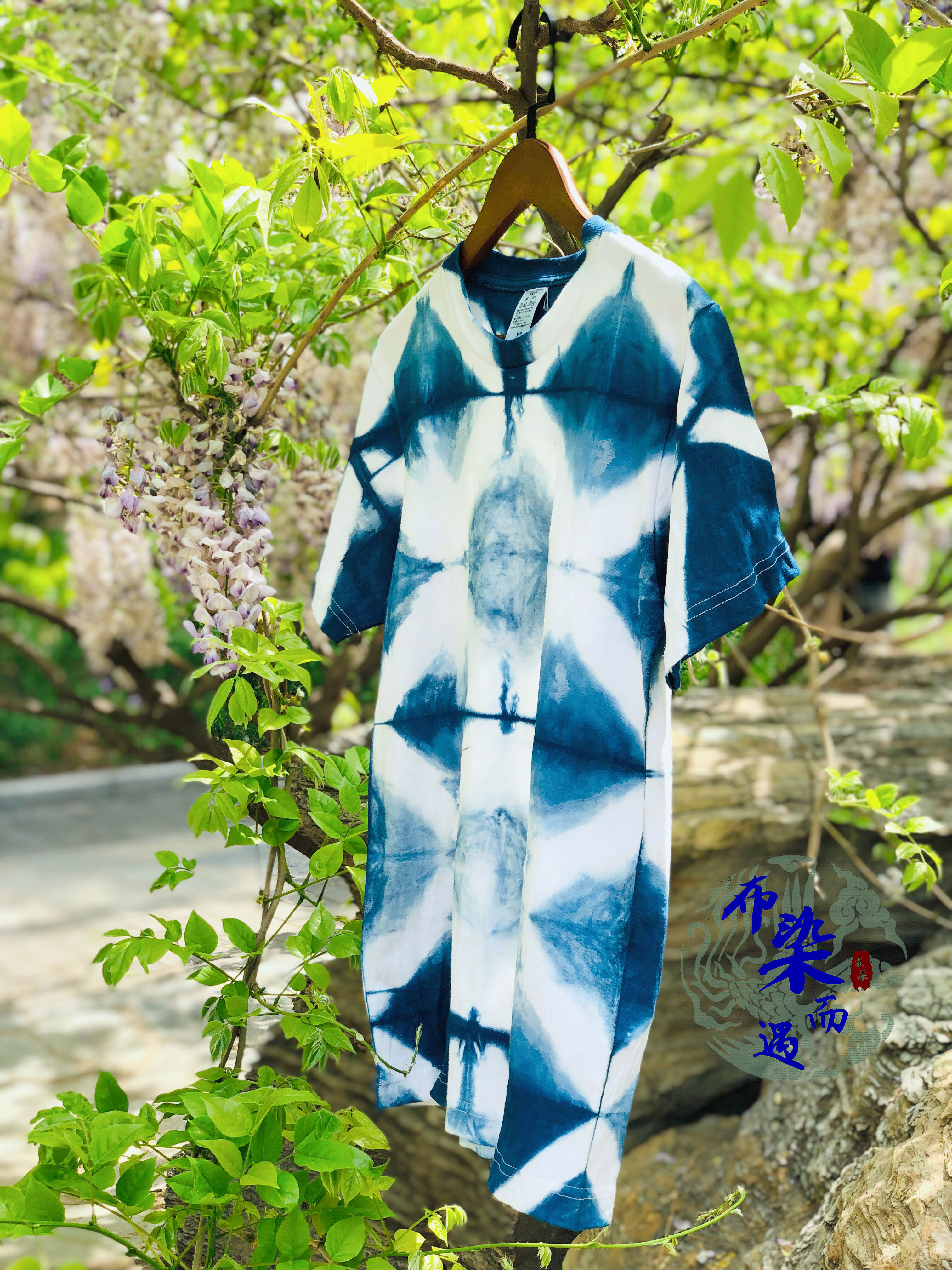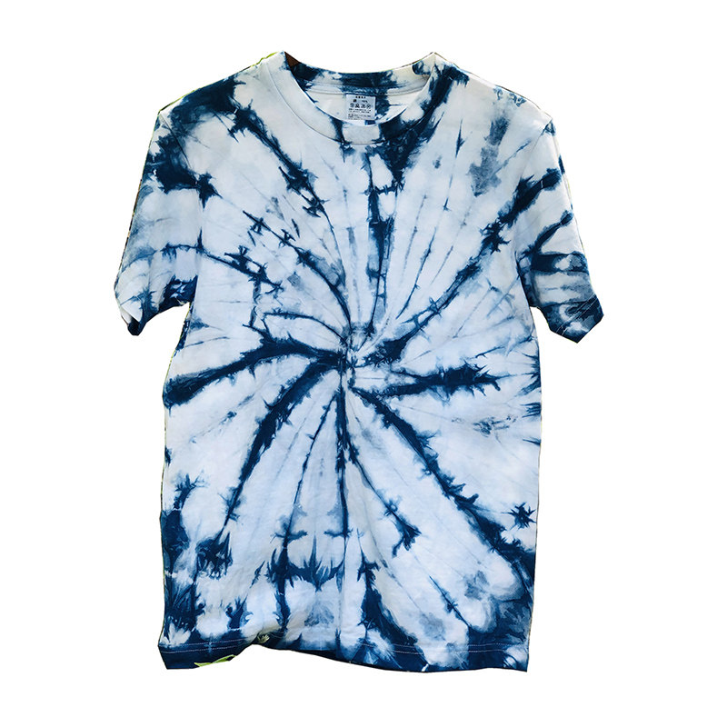 Original design new handmade blue-dyed grass-dyed tie-dyed pure cotton T-shirt summer wild men and women's short-sleeved base
