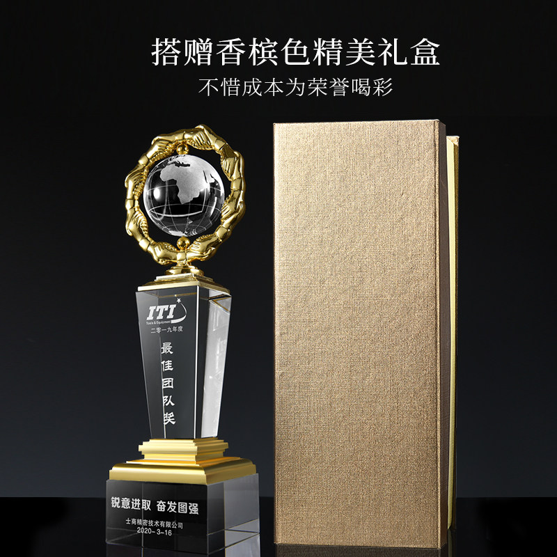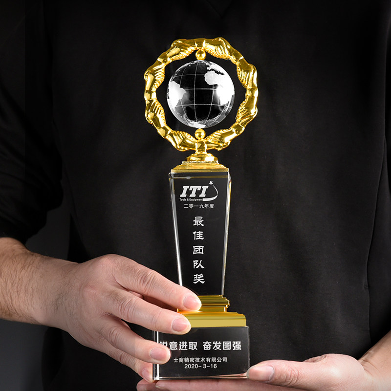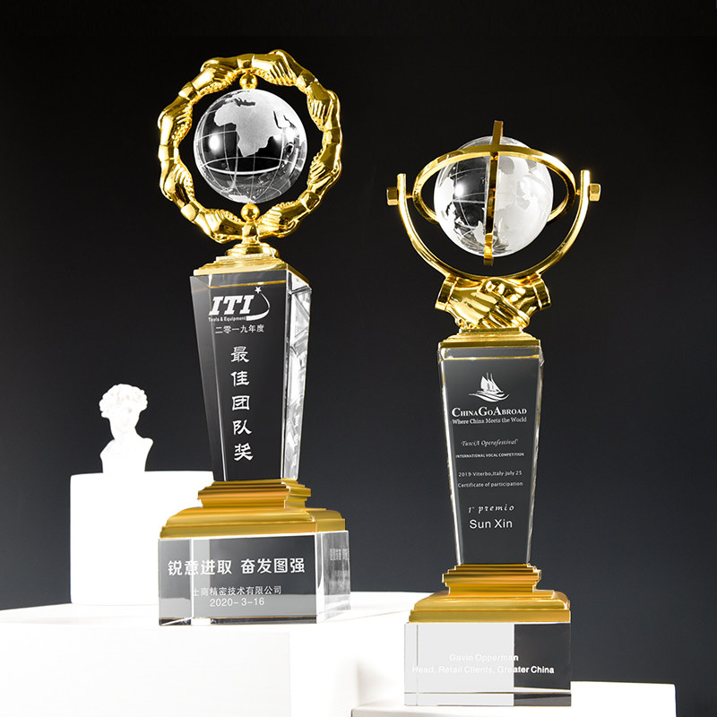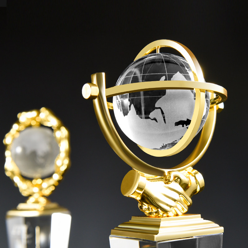 Crystal trophy custom metal handshake globe creative custom award excellent team cooperation win-win souvenir
