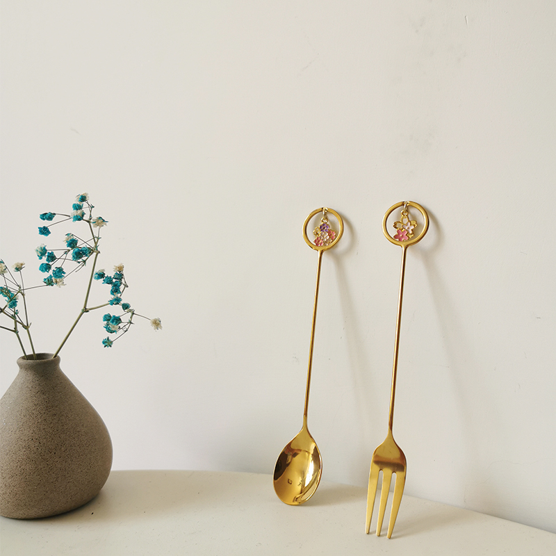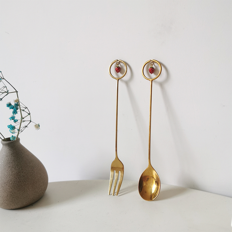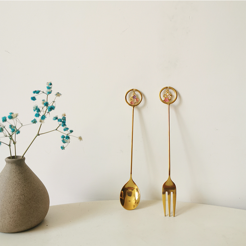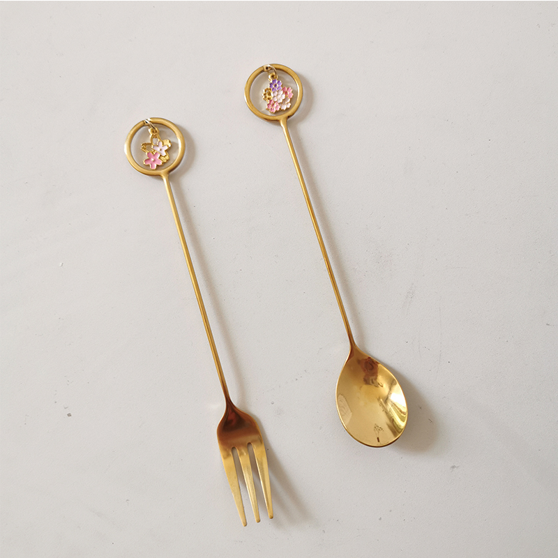 A single strawberry pendant fork, a single strawberry pendant spoon, a pair of strawberry pendant forks and spoons, a pair of cherry blossom pendant forks, a single silver butterfly spoon, a single golden butterfly spoon