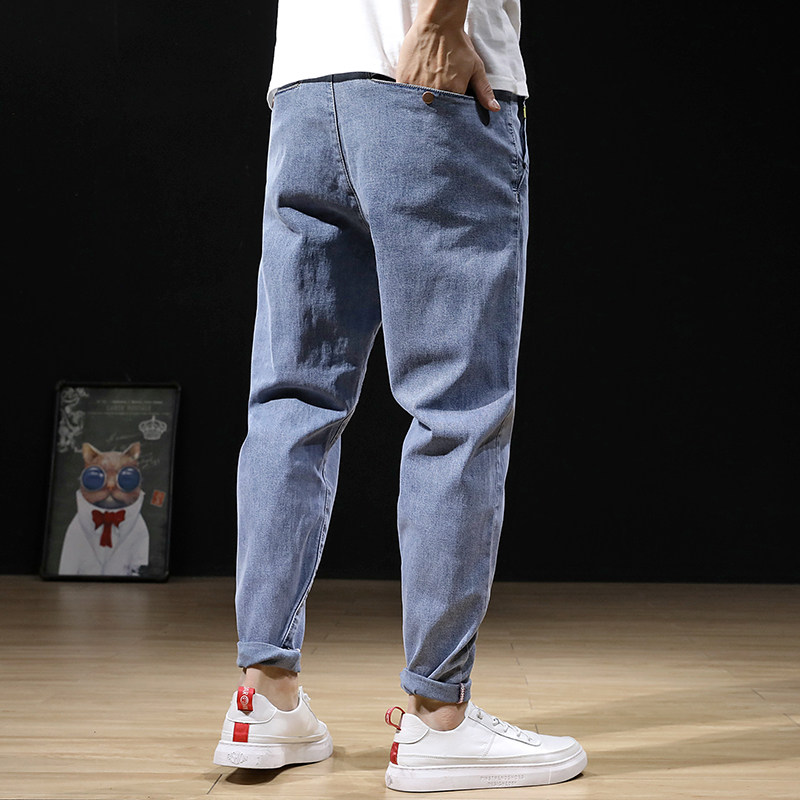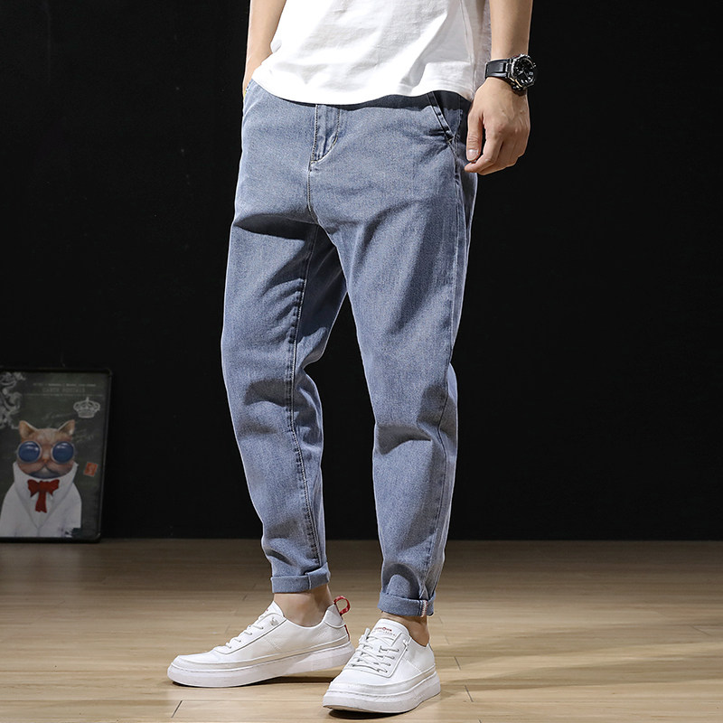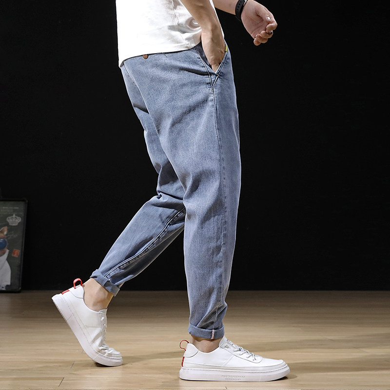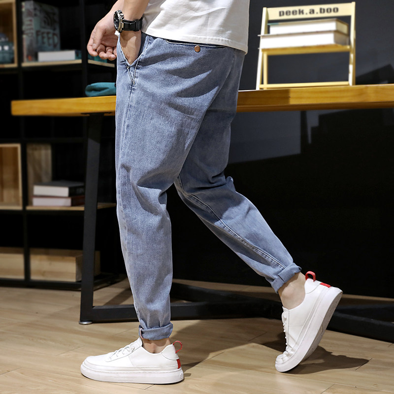 Summer light color elastic jeans for men slim slim feet fashion Korean version of all-match nine point pants for men summer thin