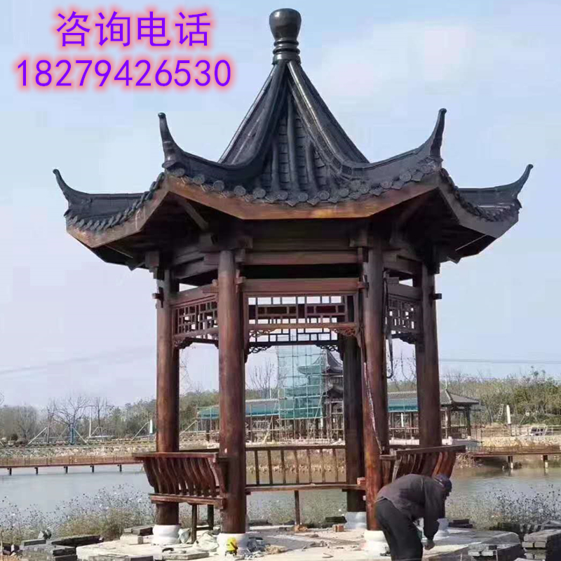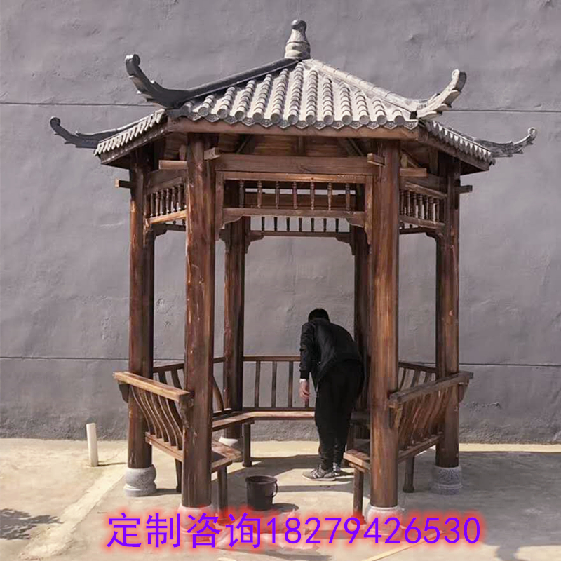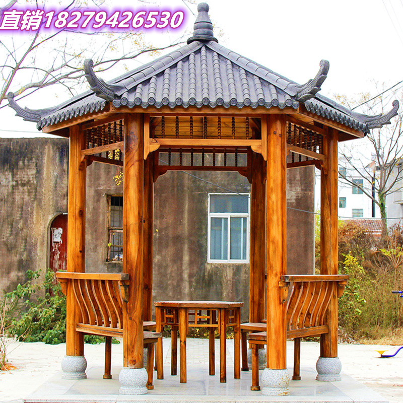 Hexagonal gazebo outdoor courtyard solid wood four-corner ancient building carbonized anti-corrosion wooden house landscape garden antique Chinese pavilion