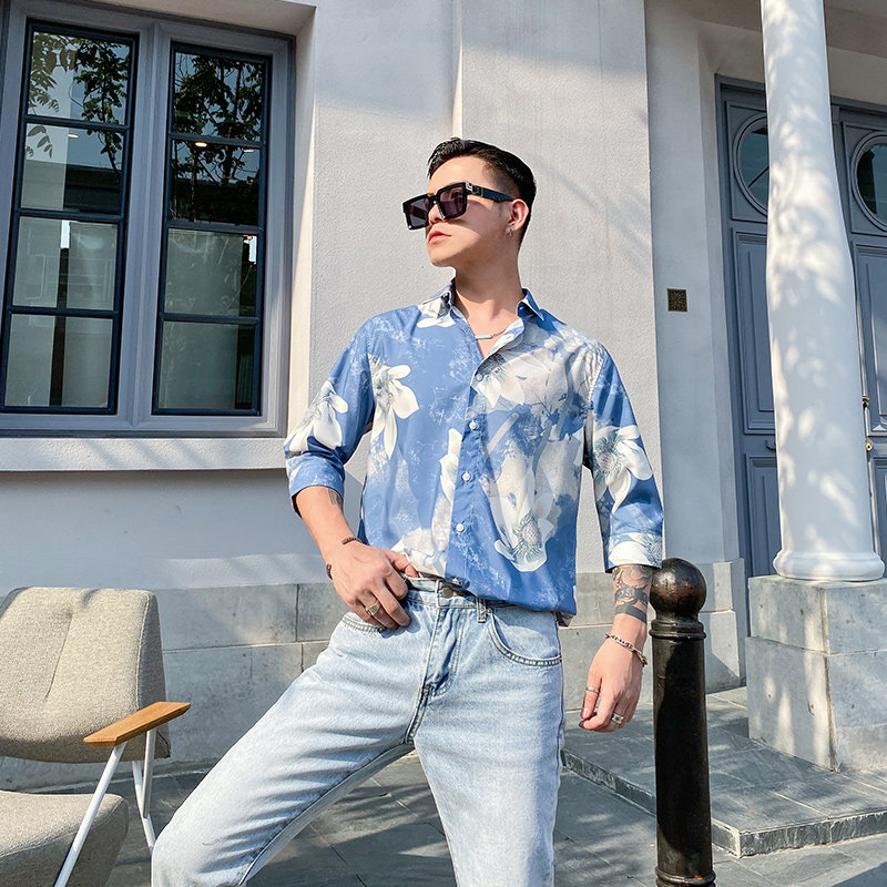 pop men's summer men's half-sleeved printed shirt loose personality blue flower trend flower shirt five-point sleeve