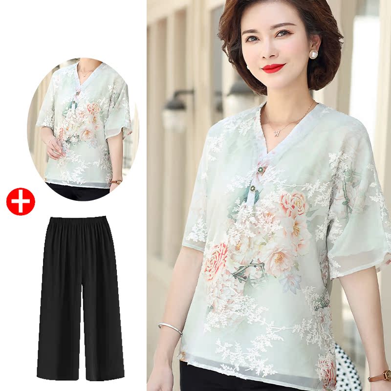 Mom Foreign Pie Two-piece Set Clothes Middle-aged Women Summer Clothes 2022 New Middle Aged Snow-spinning Shirts T-shirts