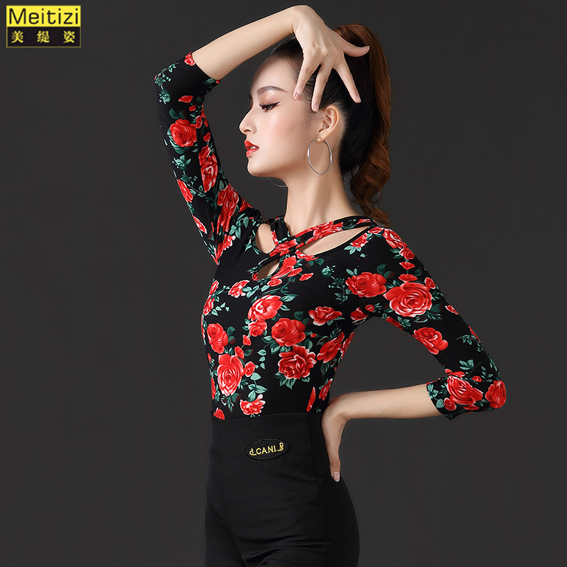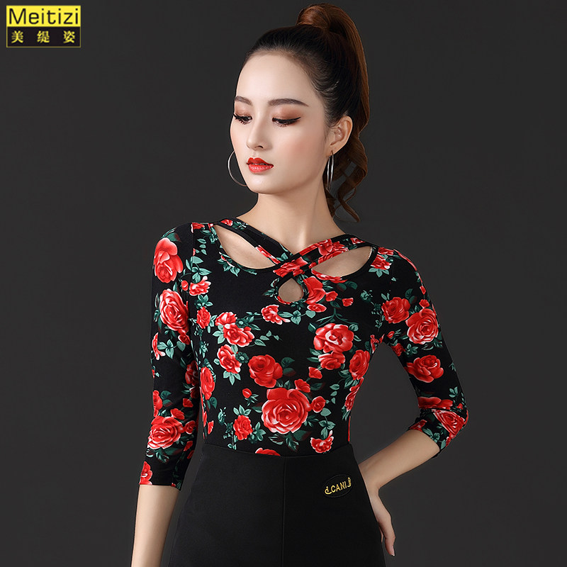 Latin dance practice clothes women's new short-sleeved ballroom dance modern tops adult national standard printed dance clothes summer