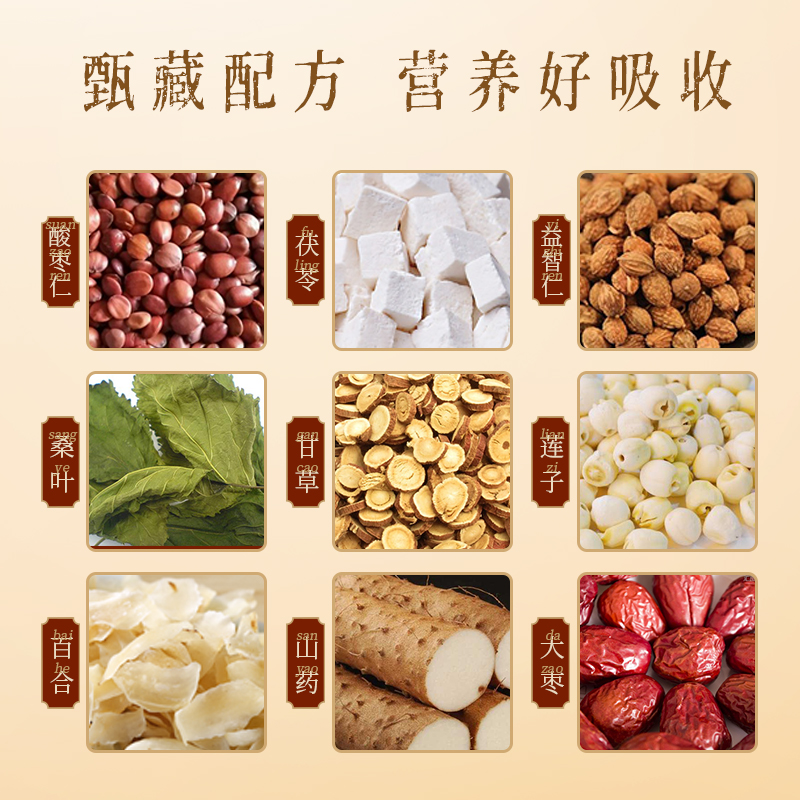 Jujube kernel Poria puzzle kernel Mulberry leaf Licorice root Lotus seed Lily Yam Red jujube Gardenia