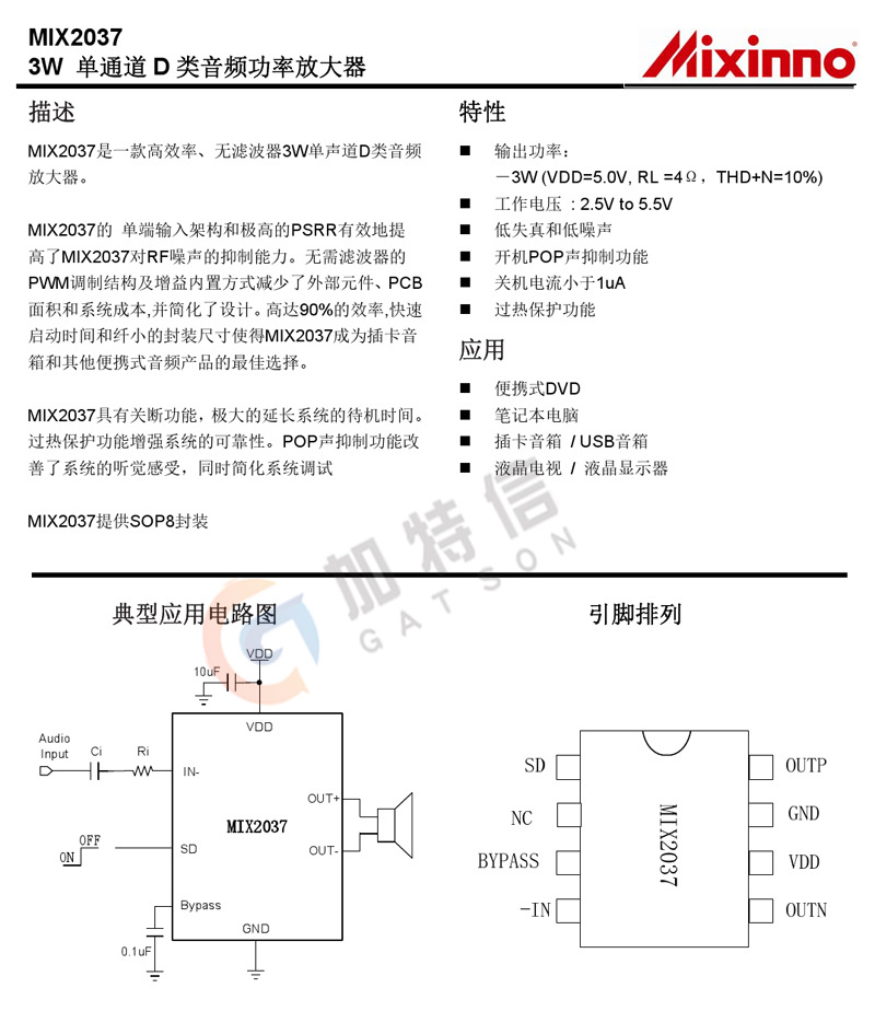 MIX2037 SOP8 MIXINNO Original 3W Single Channel Class D Audio Power Amplifier