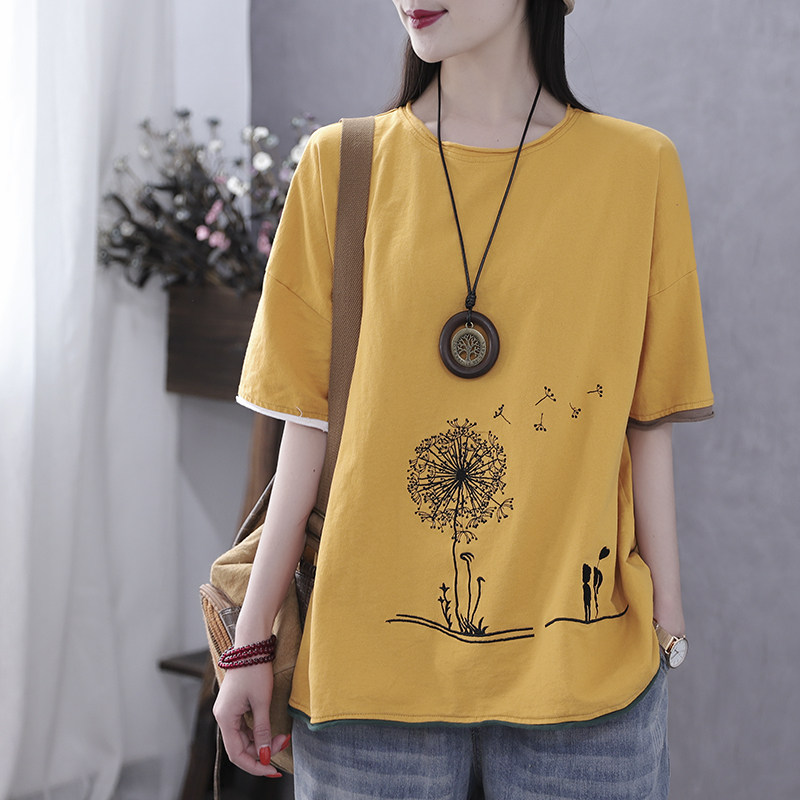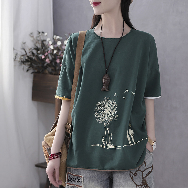 Han Soyi retro art Summer 50% sleeves Round Collar Blouse Loose With Lazy Wind Embroidered Dandelion T-shirt Woman