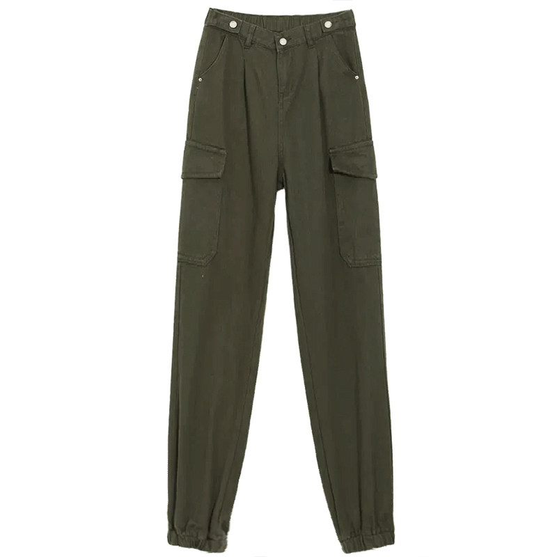 The female pants are high in the waist.: