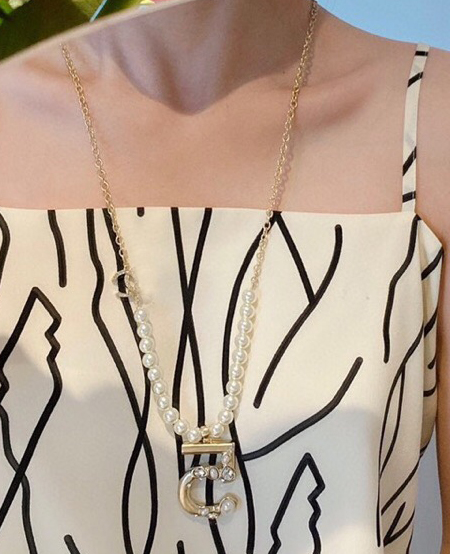 Light Gold Logo 5 Shape Pendant Pearl Long Necklace that Gets More Beautiful
