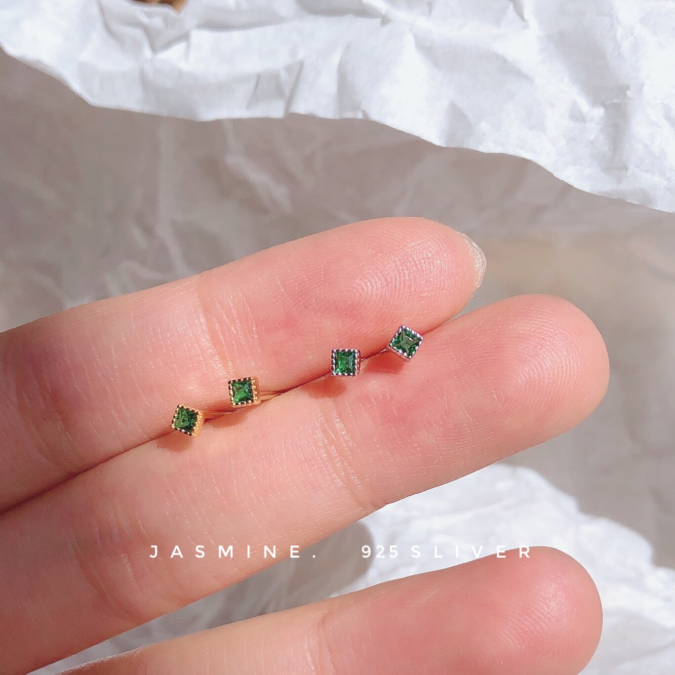 S925 pure silver , knock mini ear-raising , sleep without picking small square green diamond geometric earpins for male and female students