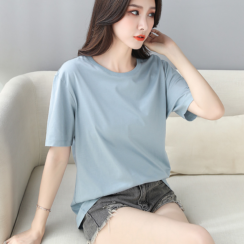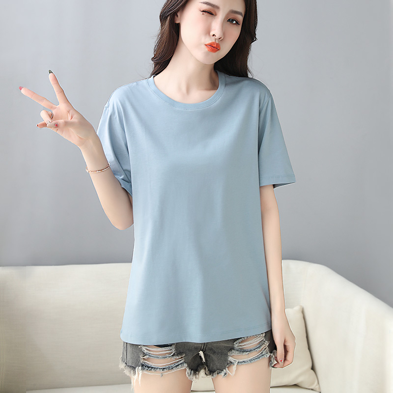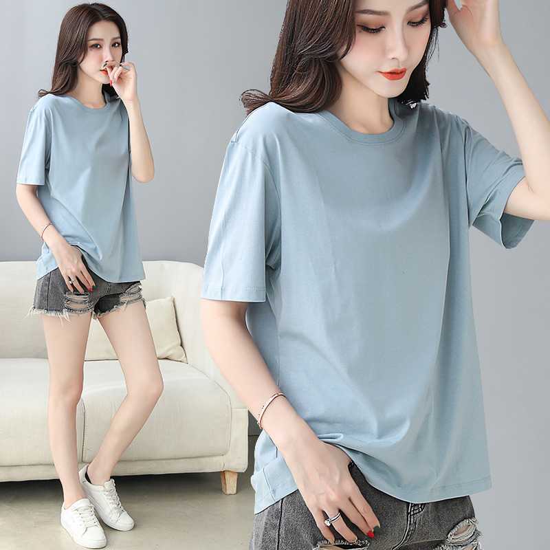 Light blue short sleeve woman 2022 new loose Korean version T-shirt pure cotton 100 hitch long version large size skinny blouse