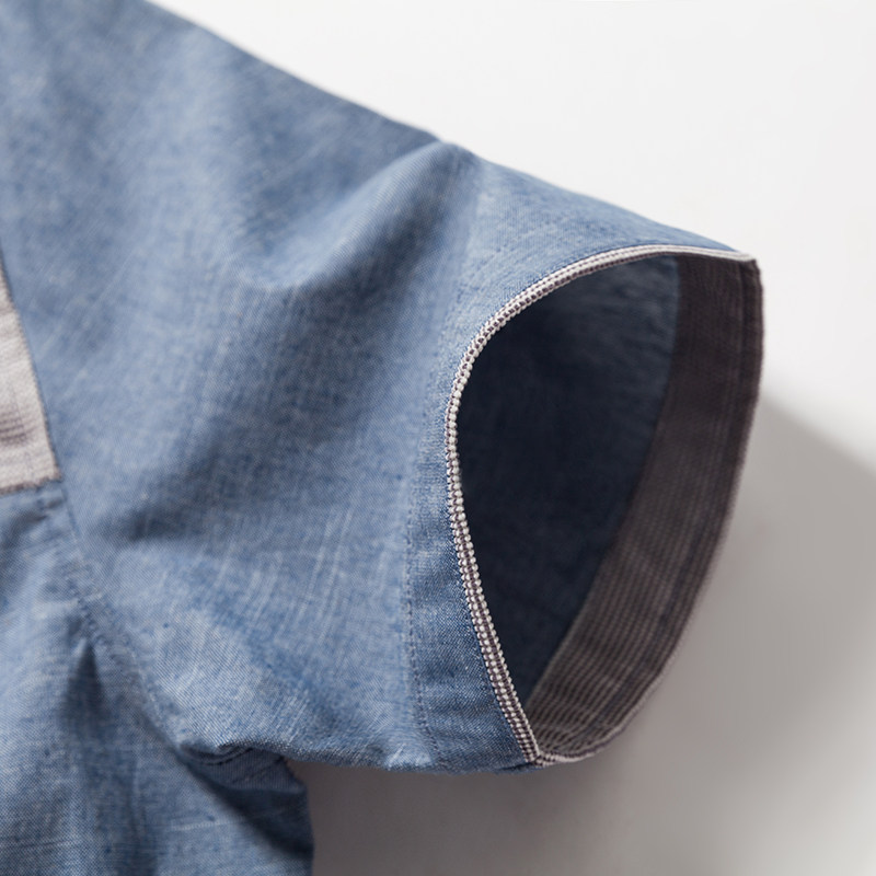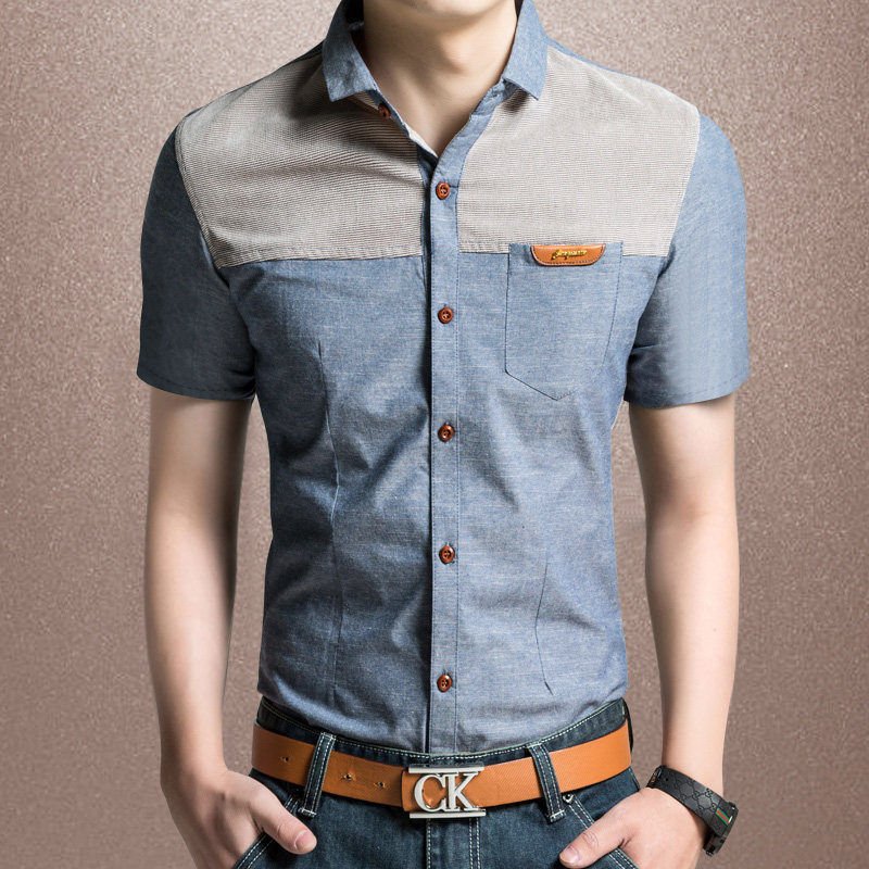 European station 2021 summer men's casual shirt cotton Korean version slim denim stitching short-sleeved shirt trendy large size