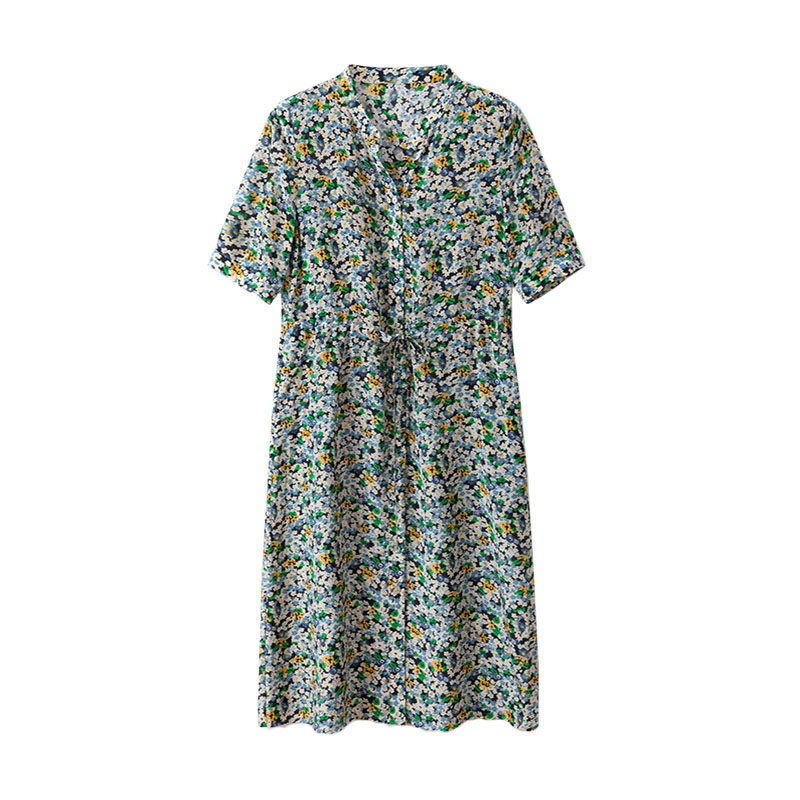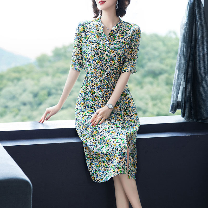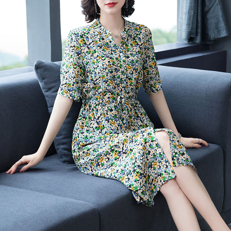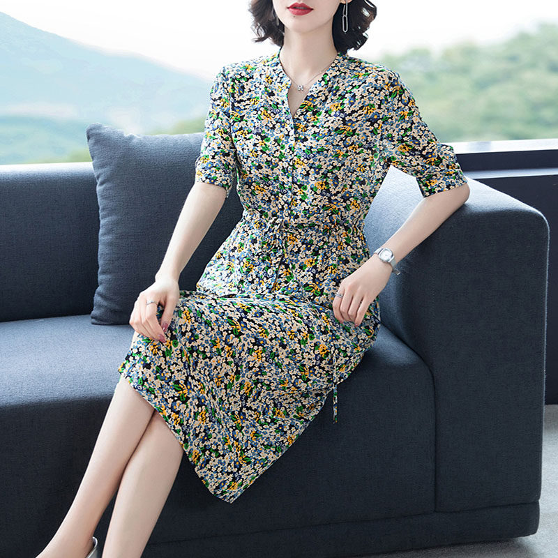 Crepe de chine silk dress women's young style summer new European and American fashion mulberry silk floral mid-length belt skirt