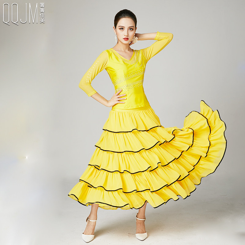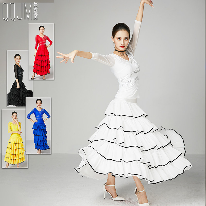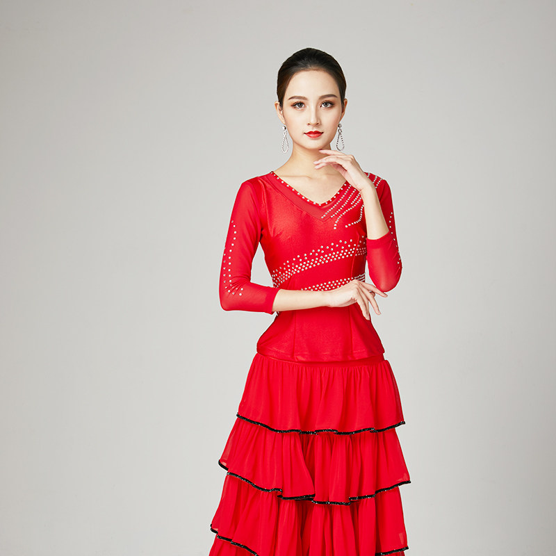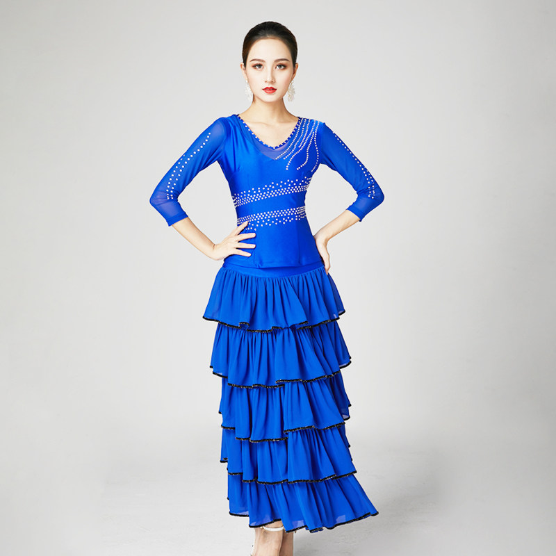 Modern dance skirt new performance suit adult waltz V-neck hot drill top chiffon skirt two-piece set