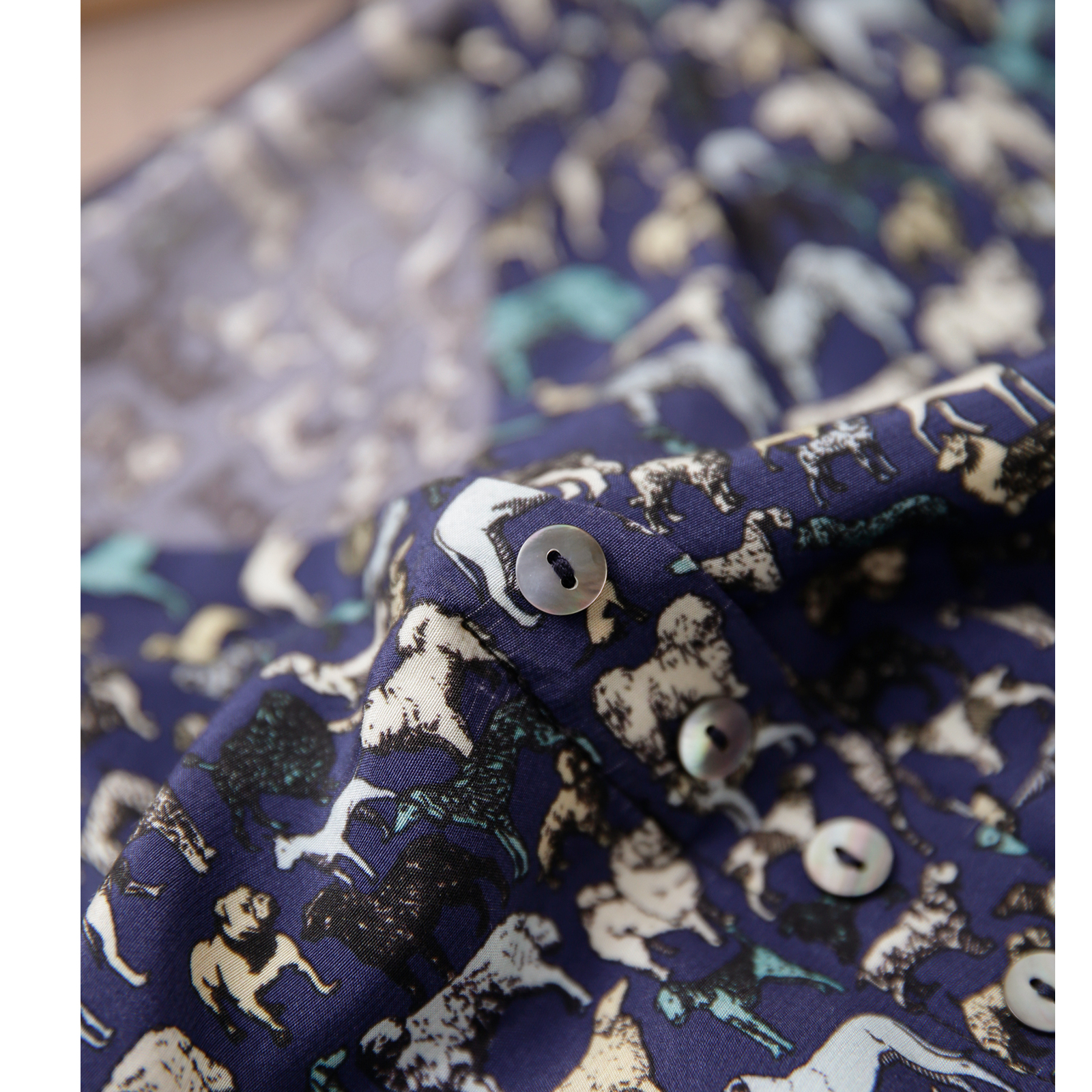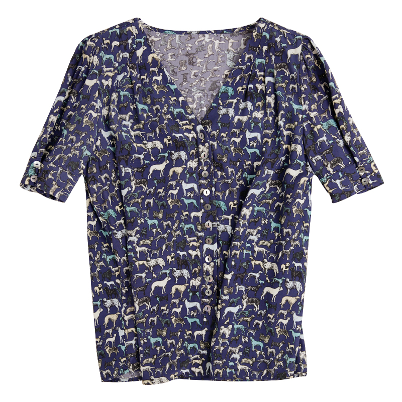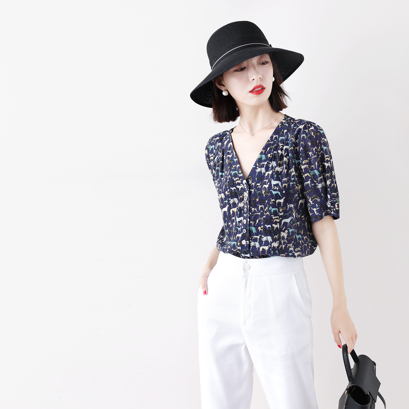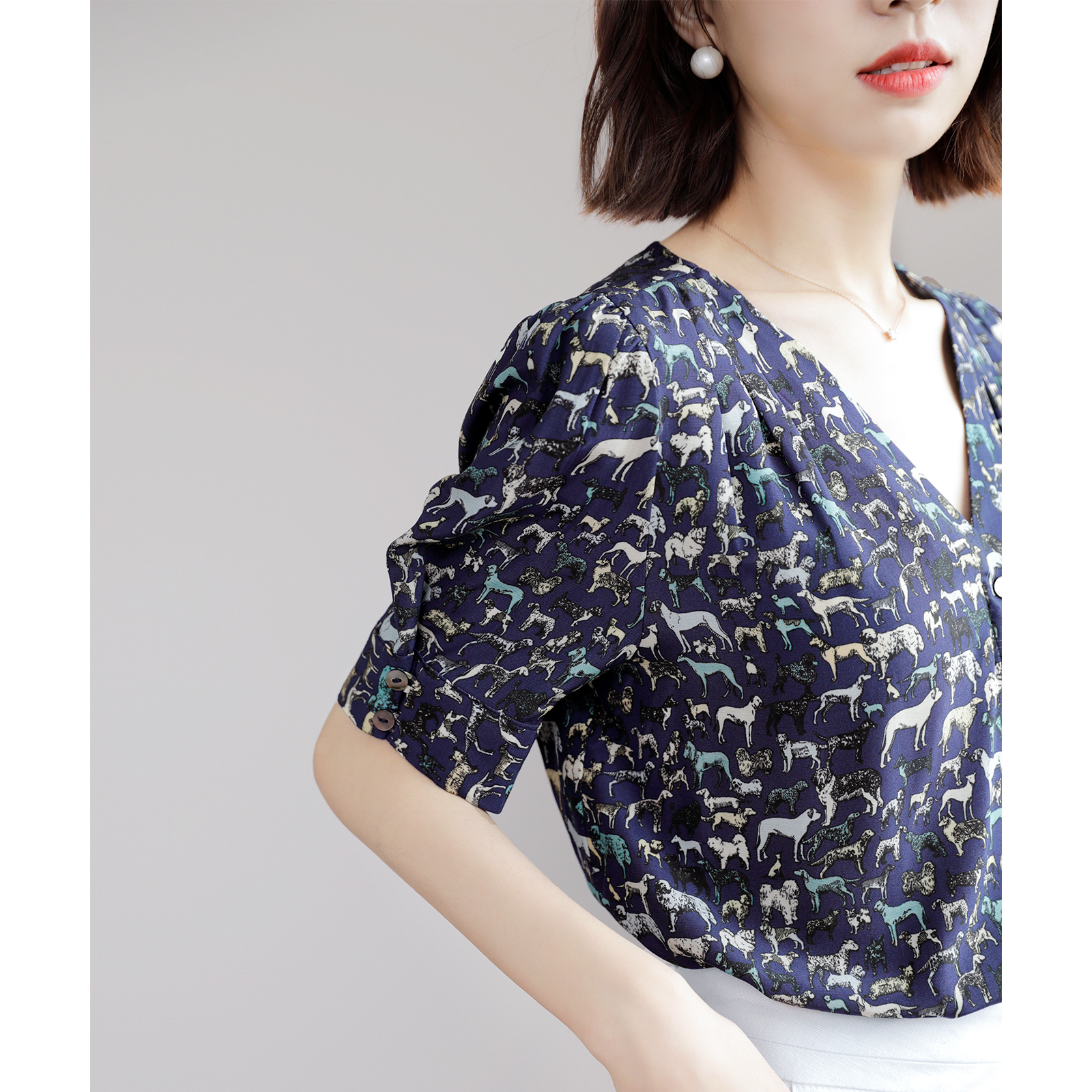 Playful and foreign-style Distinctive Trendy Cavity Temperament Animal Printed Human Silk Short Sleeve V Collar Shirt
