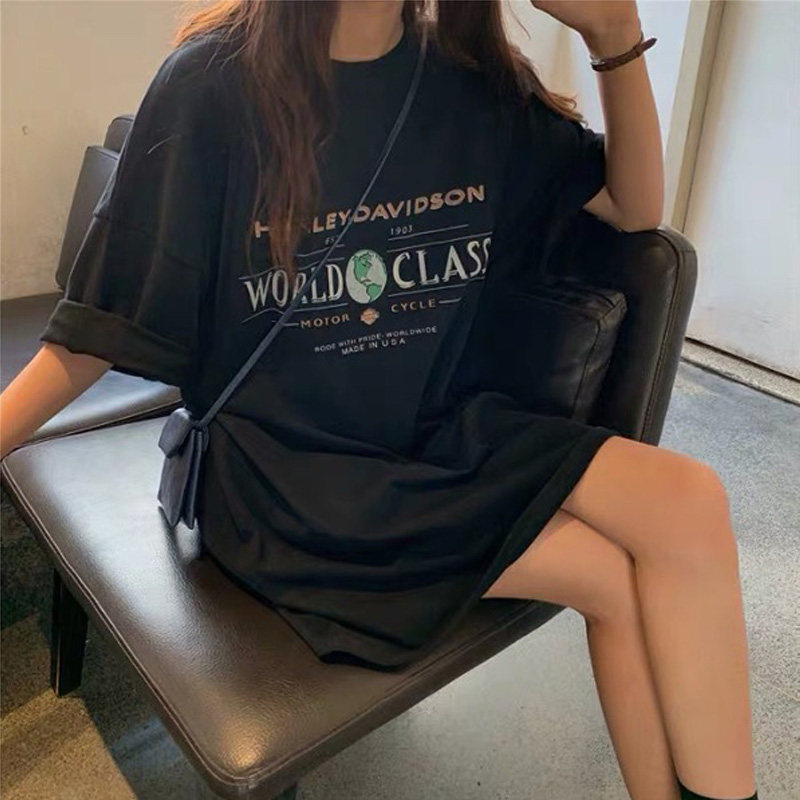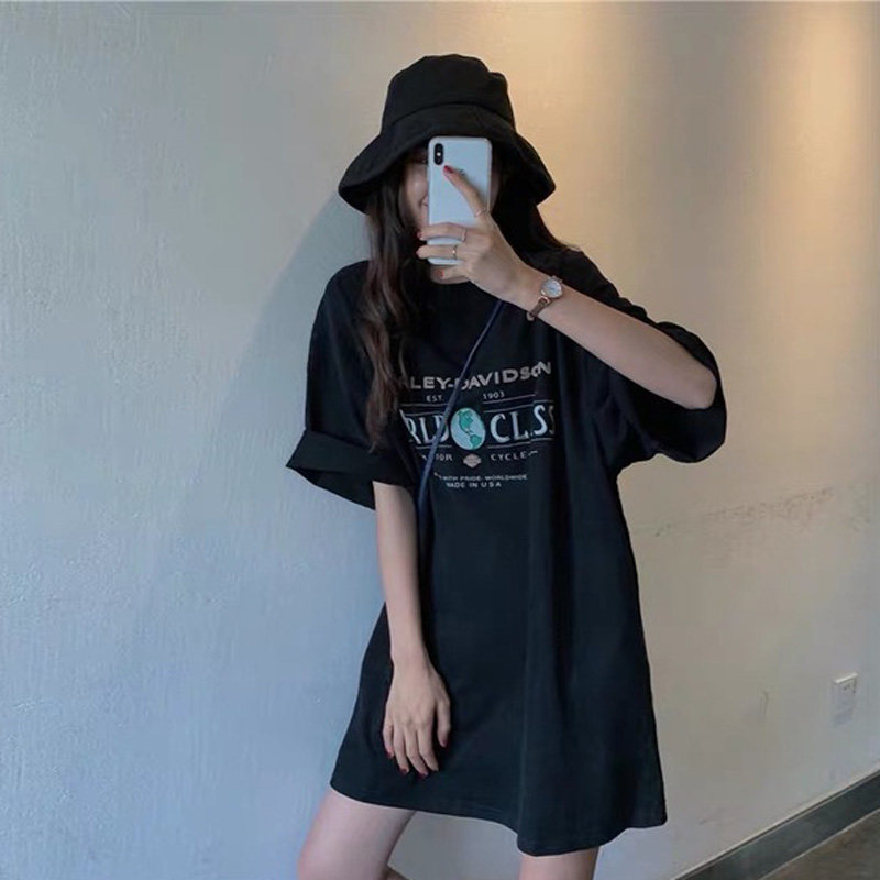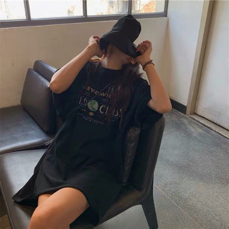 Black T-Shirt Woman Short Sleeve Loose Medium Long Version Half Sleeves Ins Overfire Summer Large Size Dress Missing Wind T-shirt