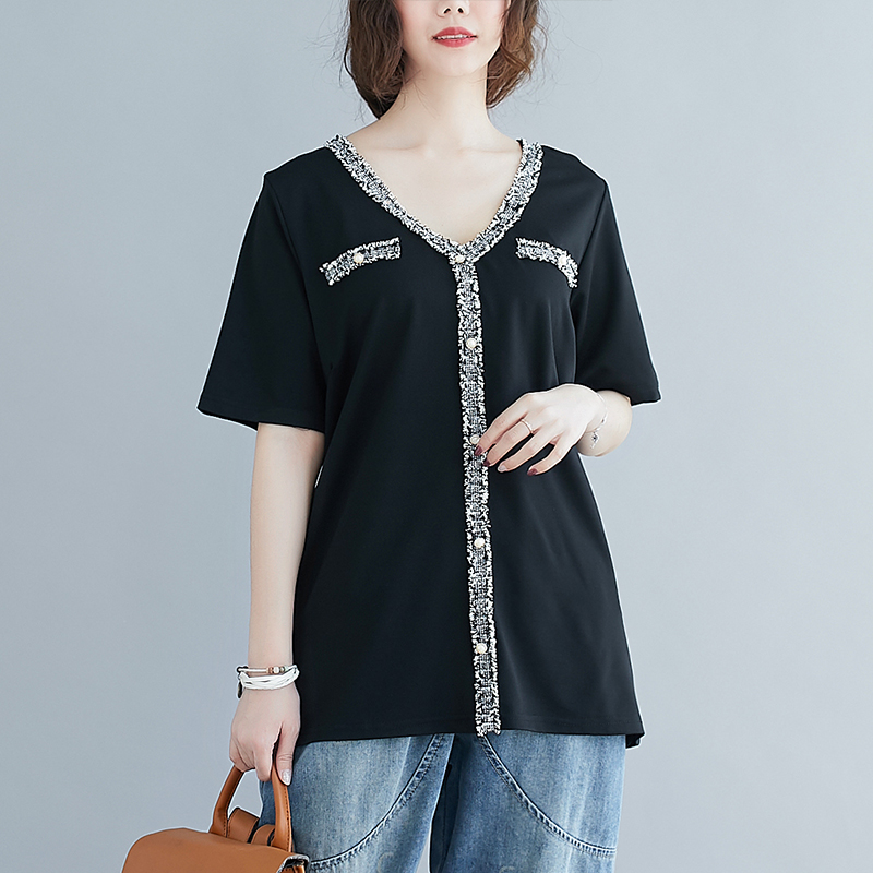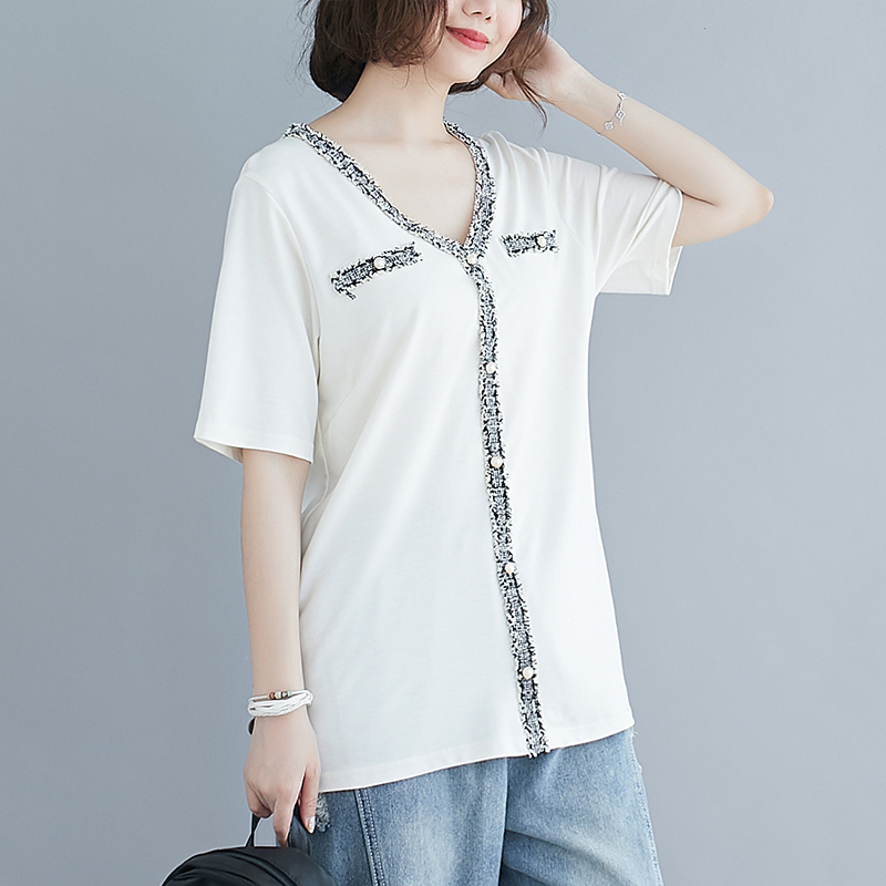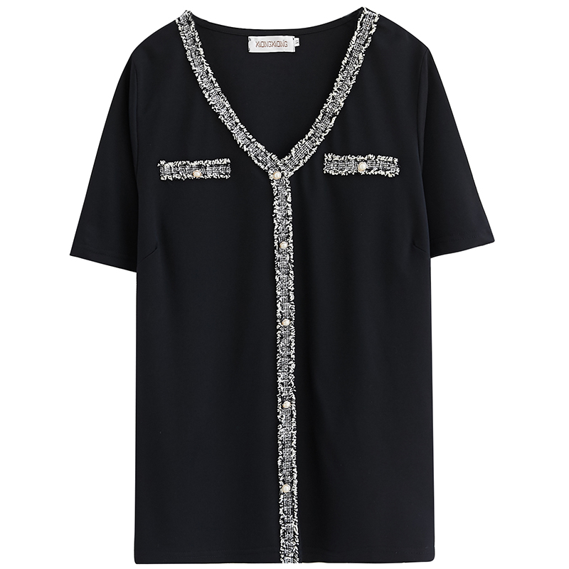 240 extra-large size women's dress 230 Fat younger sister foreign pie short sleeve V collar T-shirt 260 little fragrant wind temperament blouses undershirt