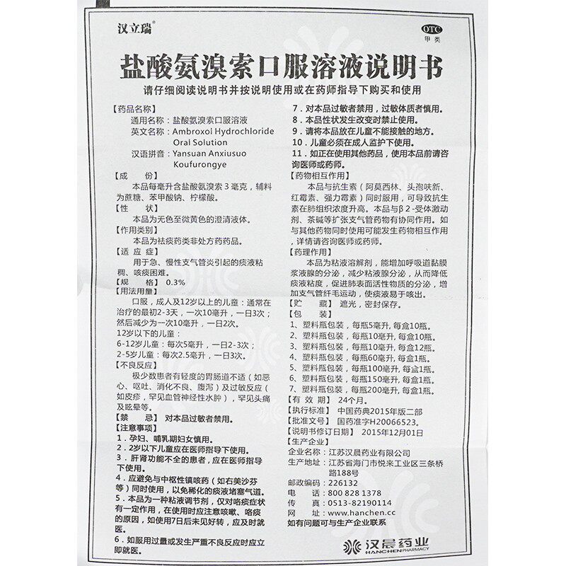 Hanliery Hydrochloric Acid Ambroxol Oral Solution 100ml Acute Chronic Bronchitis Sputum sticky cough with difficulty