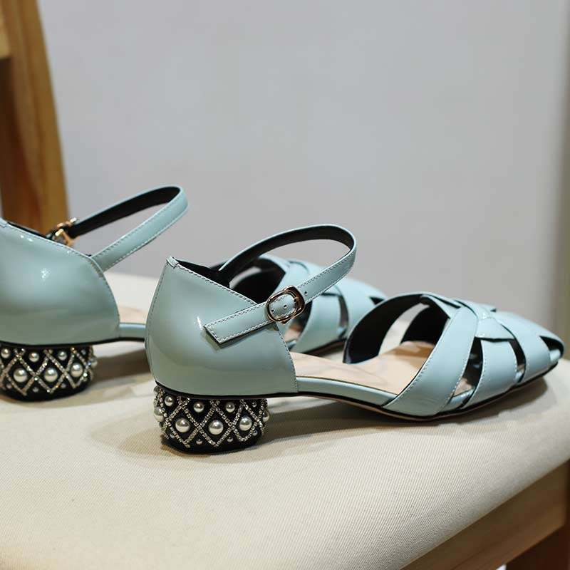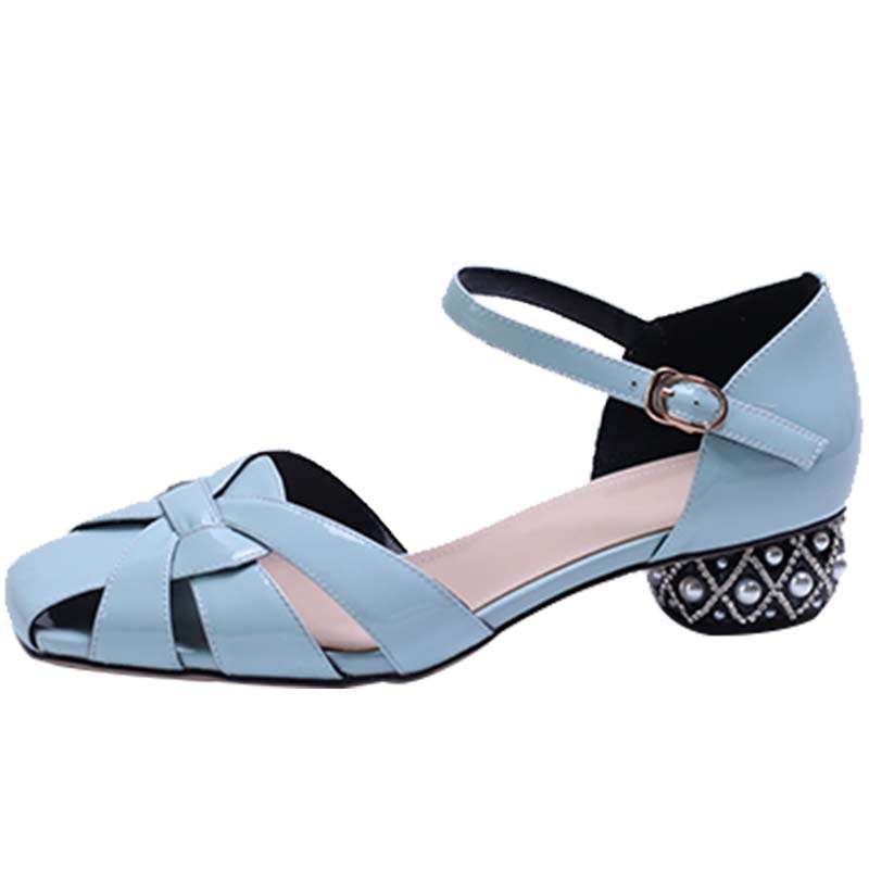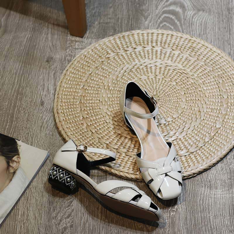 2022 popular shoes genuine leather Baotou sandals Korean version rhinestone one word with mid-heel shoes breathable summer women's shoes trend